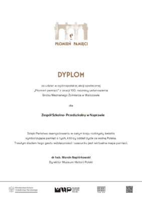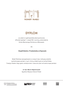 Za pełne zaangażowania uczestnictwo w akcji nasza szkoła otrzymała pamiątkowy dyplom, stanowiący wyraz uznania dla podjętych działań.
