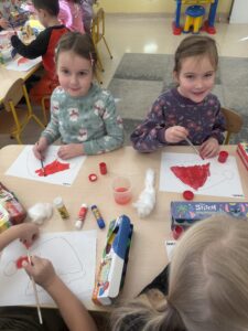 Podczas zajęć muzycznych przedszkolaki uczyły się piosenki „Piosenka o Świętym Mikołaju”, a w trakcie zabaw ruchowych z radością uczestniczyły w aktywnościach „Renifery i Mikołaj” oraz „Zaprzęg reniferów”. W ramach działań plastycznych Tygryski ozdabiały czapkę Mikołaja watą, tworzyły własne listy w formie rysunku przedstawiającego wymarzony prezent, który następnie trafiał do naszej „Skrzyni Mikołaja”.
