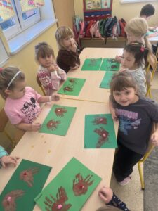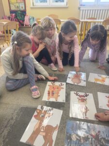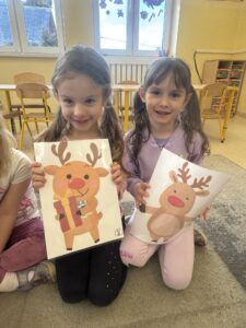 Dzieci oglądały ilustracje reniferów, a następnie wykonały kreatywną pracę – renifery z odcisku dłoni. Całość projektu dopełniły tańce przy świątecznej muzyce oraz quiz wiedzy o Mikołaju, który dostarczył dzieciom mnóstwo radości.