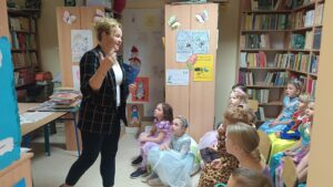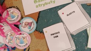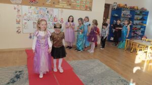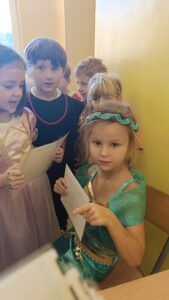 Dzisiejszy dzień w naszej grupie był prawdziwie magiczny! Już od rana dzieci wyruszyły na niezwykłą przygodę z mapą skarbów, która prowadziła przez świat baśni i bajek. Po rozwiązaniu pierwszej zagadki mali odkrywcy dotarli do biblioteki – skarbnicy bajek, gdzie czekała na nich pani Jola Barglik. Przeczytała im piękną opowieść pt. „Dzień fajności”, która przeniosła wszystkich w świat pełen radości i przyjaźni.Potem dzieci ruszyły na poszukiwanie ukrytych postaci z bajek. Wykonywały różne zadania – musiały dotrzeć do Roszpunki po złotych włosach, pomóc księżniczce na ziarnku grochu, rozłupując orzechy i ćwicząc przy tym paluszki. Odnalazły również zagubione pantofelki, atrybuty znanych bohaterów, a także sprytnie rozwiązywały rymowanki krasnoludków. Na zakończenie dzieci odnalazły dobrą i złą postać z bajki, ucząc się, że w każdej historii dobro zawsze zwycięża. To był dzień pełen radości, zagadek, śmiechu i prawdziwej baśniowej magii!