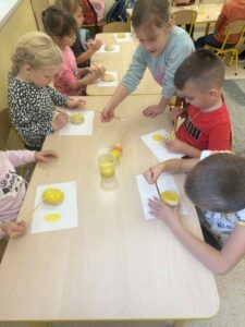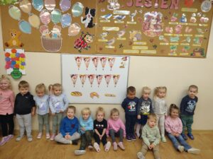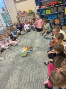 Na początku wspólnie zastanawialiśmy się, skąd bierze się chleb. Dzieci poznały etapy jego powstawania. Wzięły udział w grach i zabawach ruchowych. Aby utrwalić zdobytą wiedzę i rozwinąć zdolności manualne, przedszkolaki wykonały własne „chlebusie” z masy solnej 🥯. Każdy mały piekarz uformował swój wyjątkowy bochenek, który po wyschnięciu został pięknie ozdobiony.