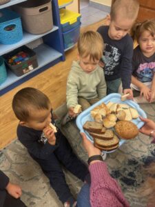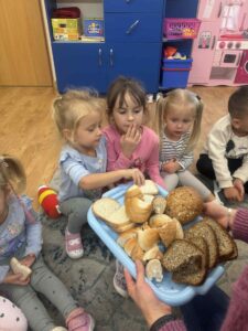 Na zakończenie zajęć odbyła się degustacja różnych rodzajów chleba – pszennego, żytniego, razowego i z ziarnami. Dzieci przekonały się, że chleb to nie tylko podstawa posiłków, ale też symbol wspólnej pracy i tradycji.