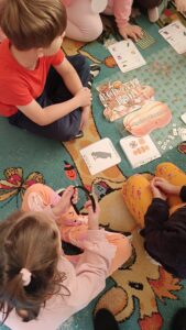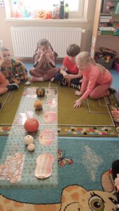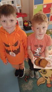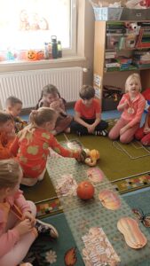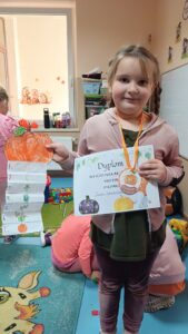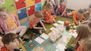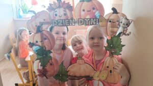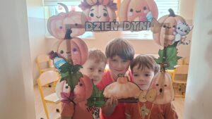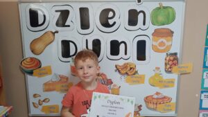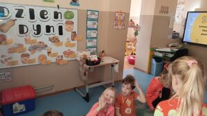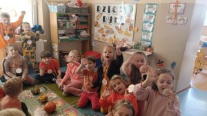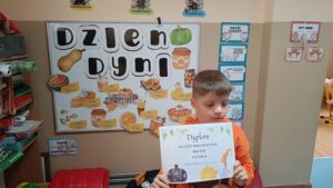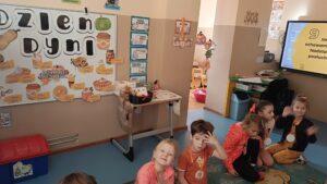 31 października w grupie sześciolatków odbyły się zajęcia pokazowe pod hasłem „Dyniowe odkrycia”. Dzieci z grupy sześciolatków, ubrane na pomarańczowo, uczestniczyły w ciekawych zabawach dydaktycznych i przyrodniczych związanych z tematyką dyni. Podczas zajęć dzieci poznały cykl życia dyni, rozwiązywały gry i zagadki językowe – liczyły sylaby, układały litery oraz brały udział w grze karcianej „Ja mam – kto ma?”. W części plastycznej wykonały własne prace przedstawiające etapy rozwoju dyni, a następnie pozowały do zdjęć w dyniowej fotoramce przygotowanej przez nauczyciela. Zwieńczeniem dnia było wręczenie dyplomów i medali „Przyjaciel Dyni” oraz wspólny poczęstunek pysznym ciastem dyniowym, przygotowanym przez Panią Katarzynę Rams. Zajęcia przebiegły w radosnej, jesiennej atmosferze, rozwijając u dzieci ciekawość poznawczą, współpracę i twórczą ekspresję.