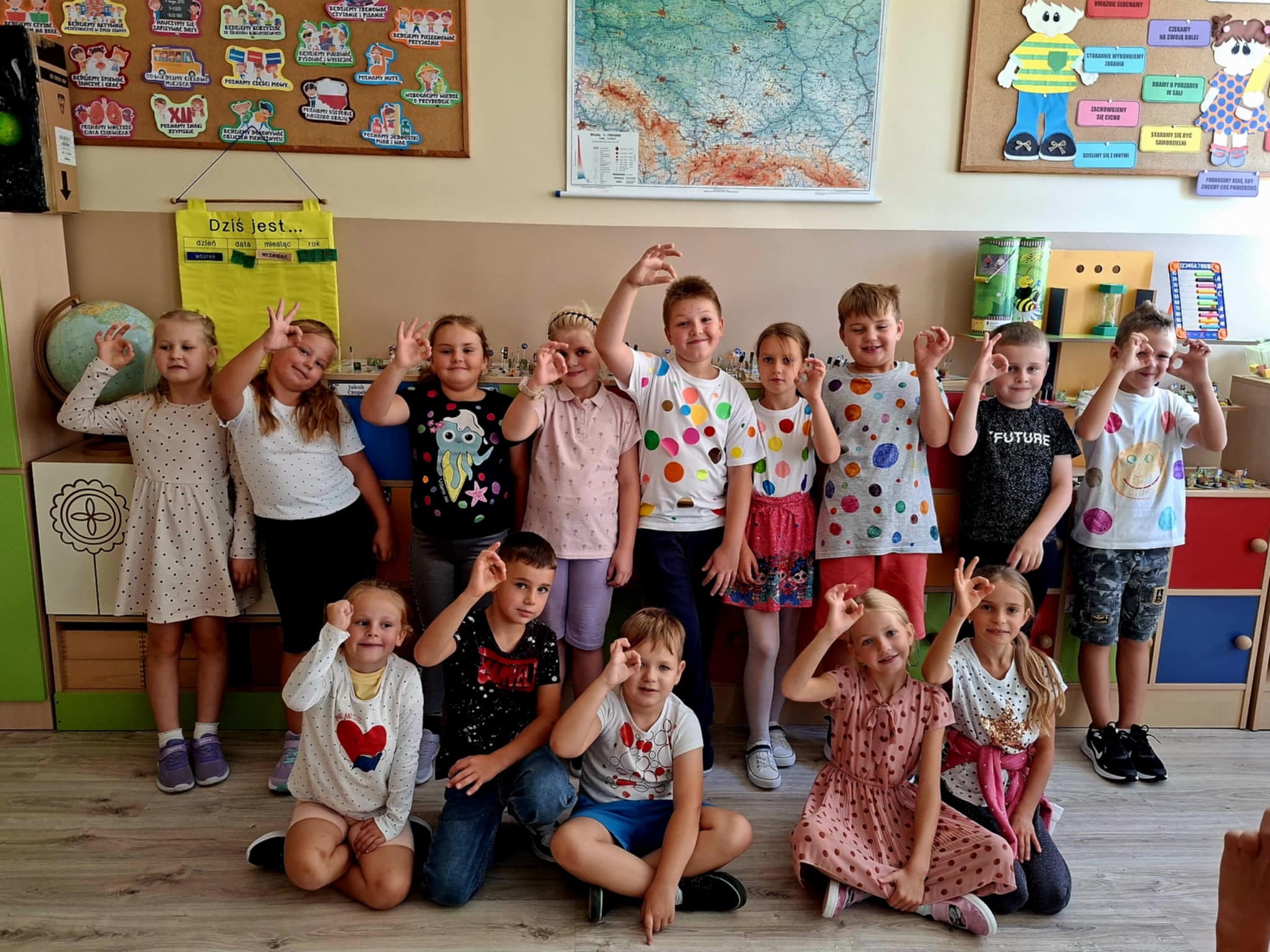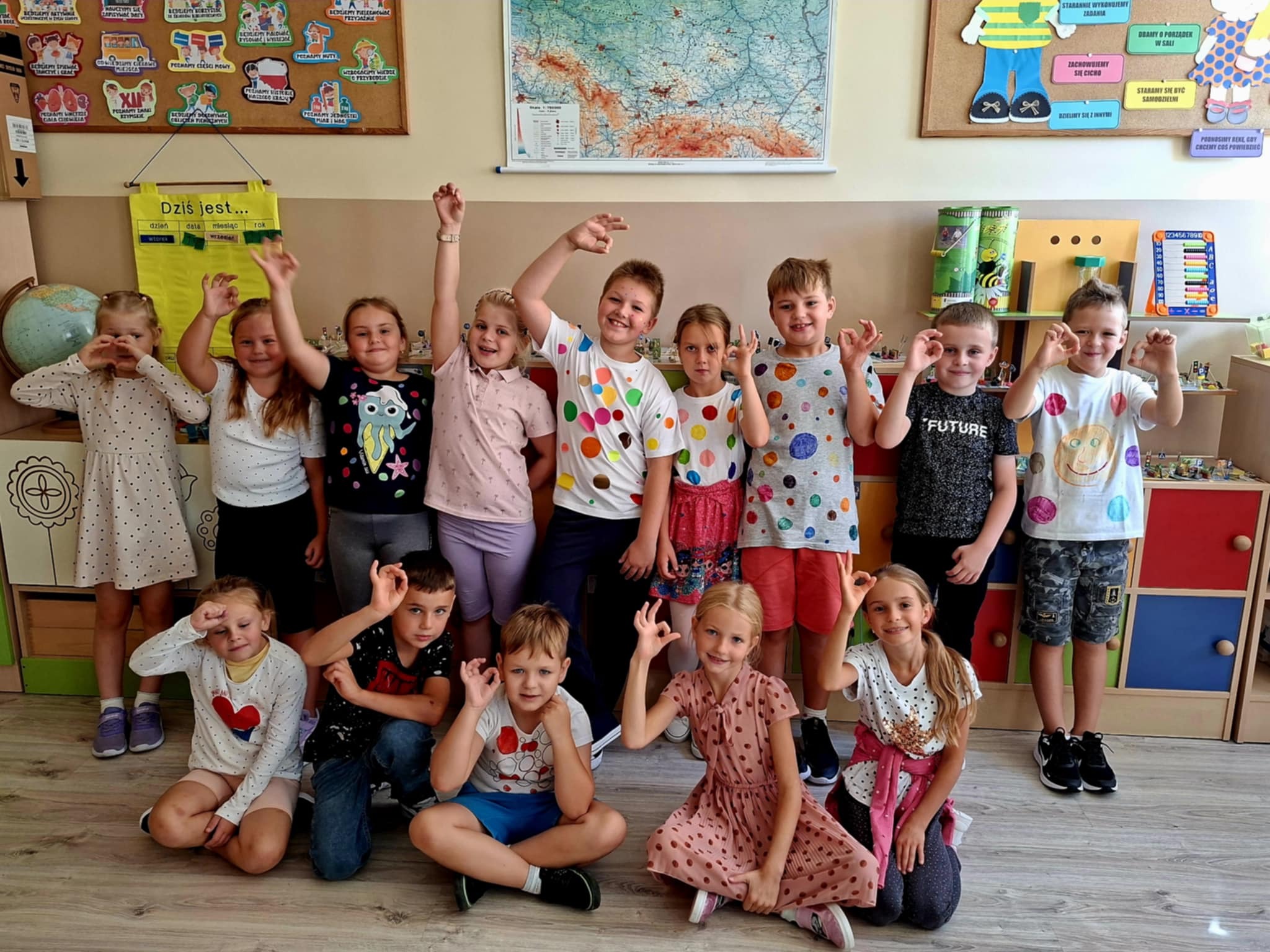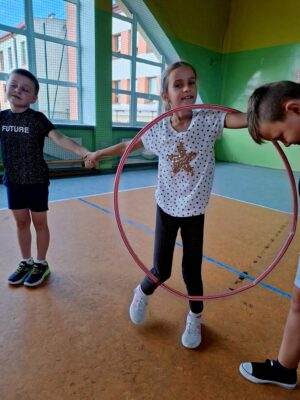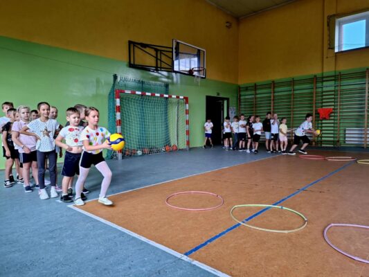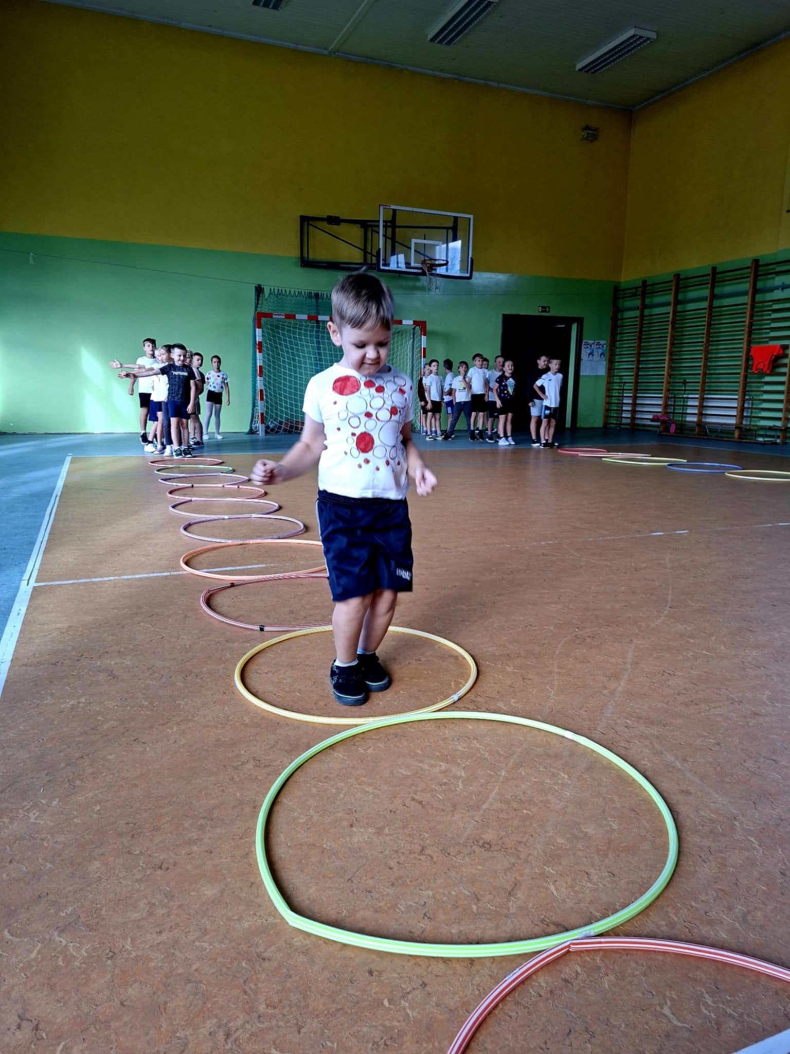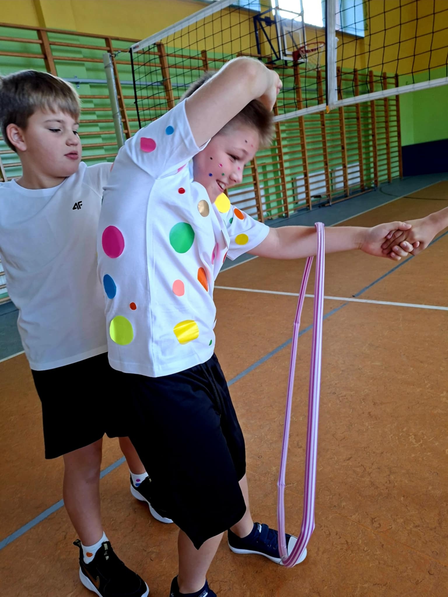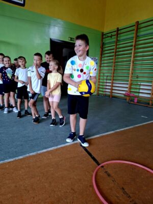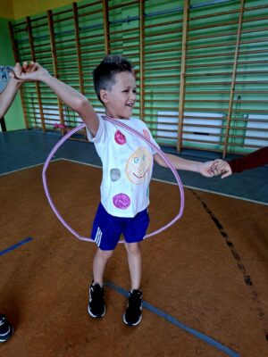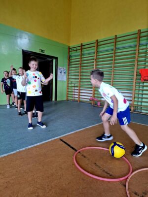 🤸 W ramach zabaw ruchowych uczniowie brali udział w „kropkowych wyścigach”, tańcu z kolorowymi kropkami oraz zabawie „Podaj kropkę”.