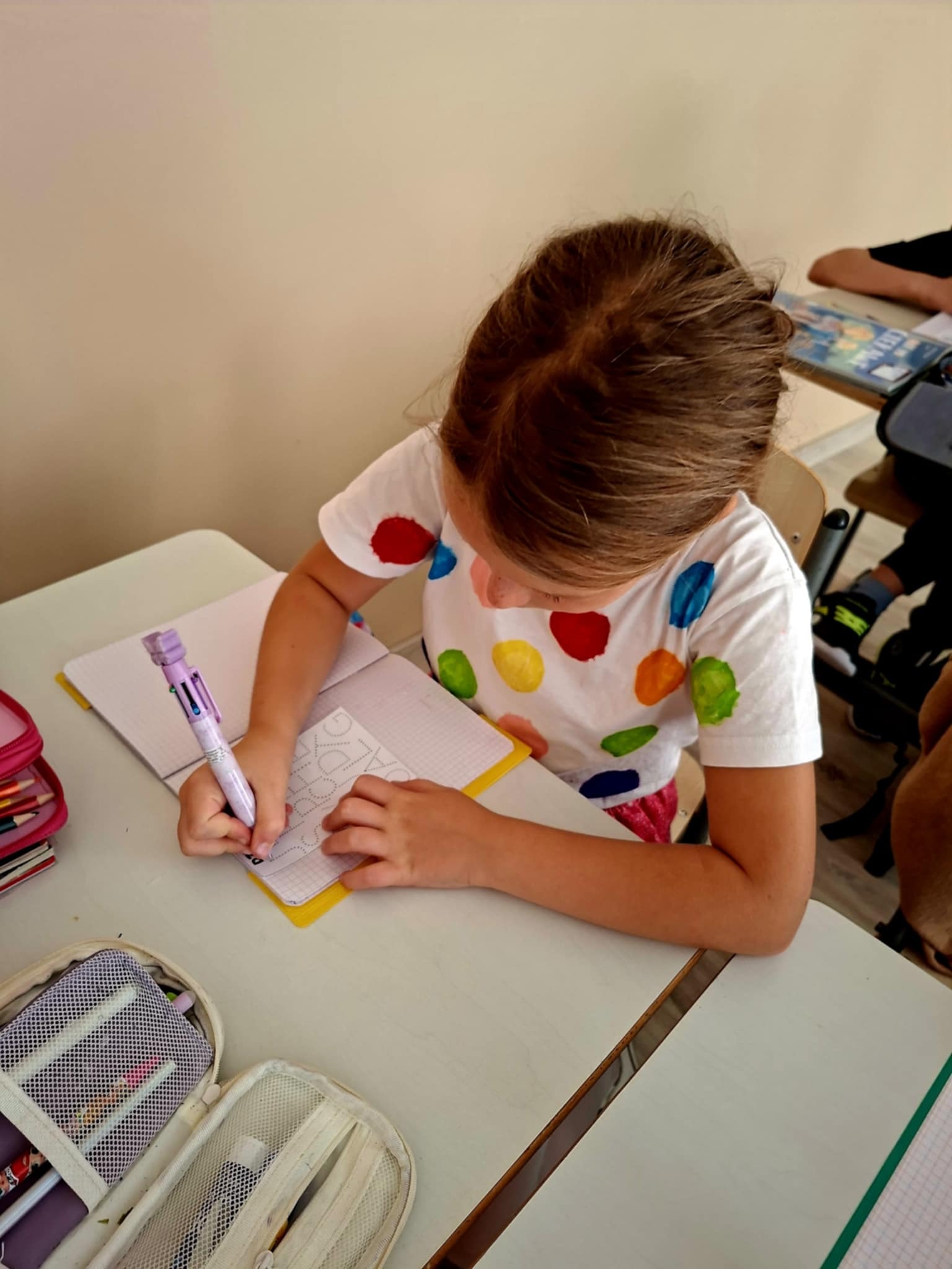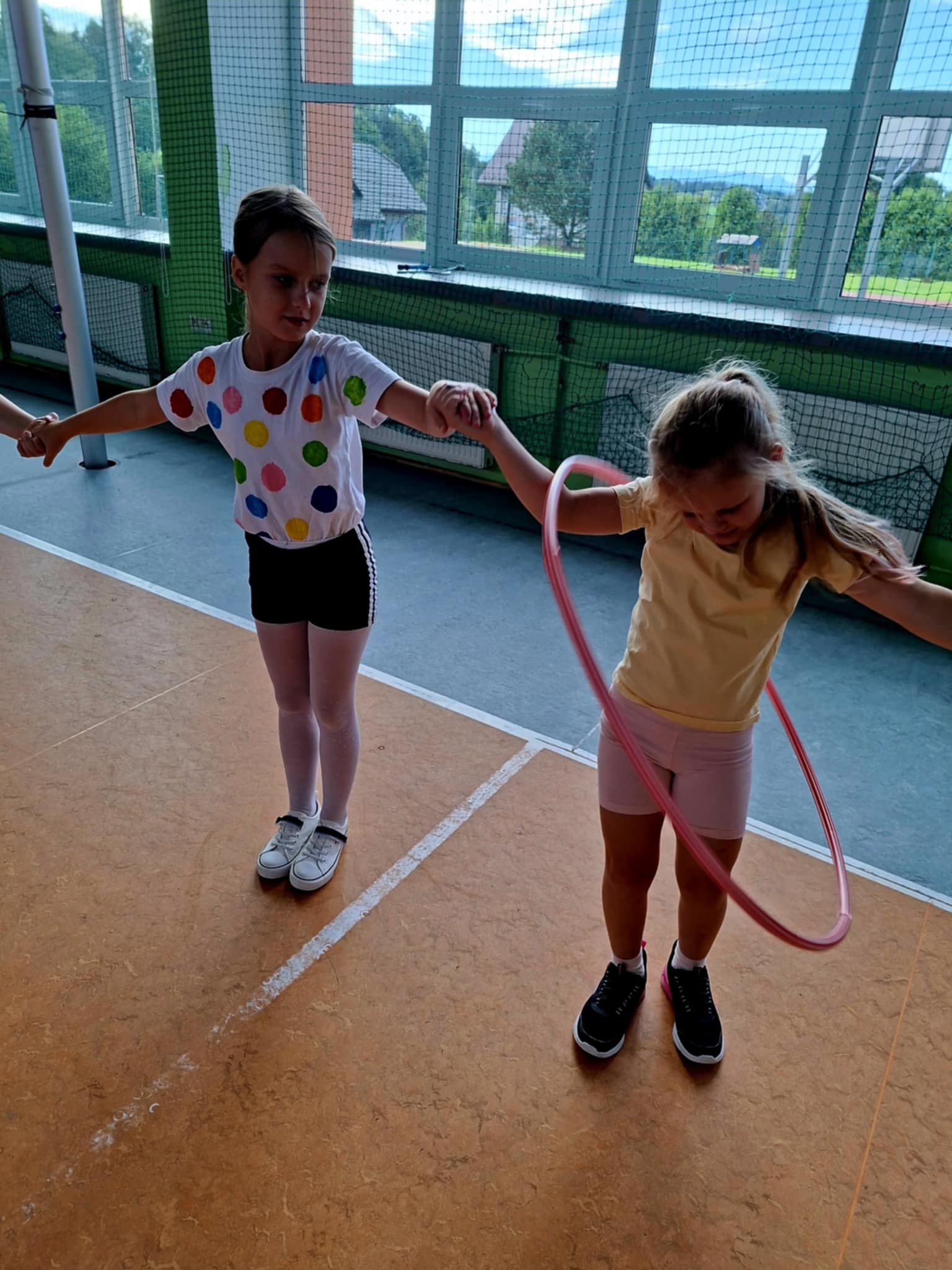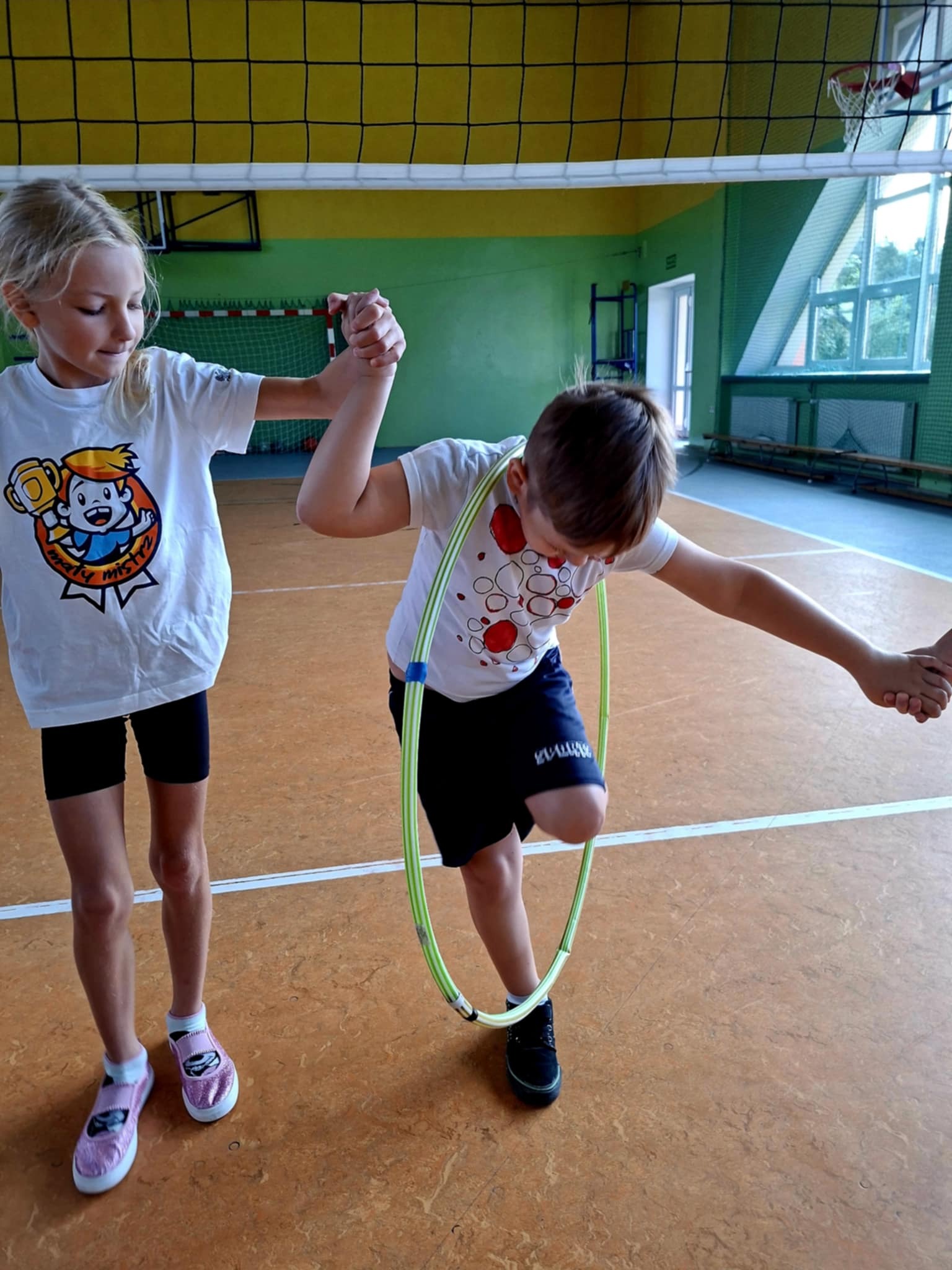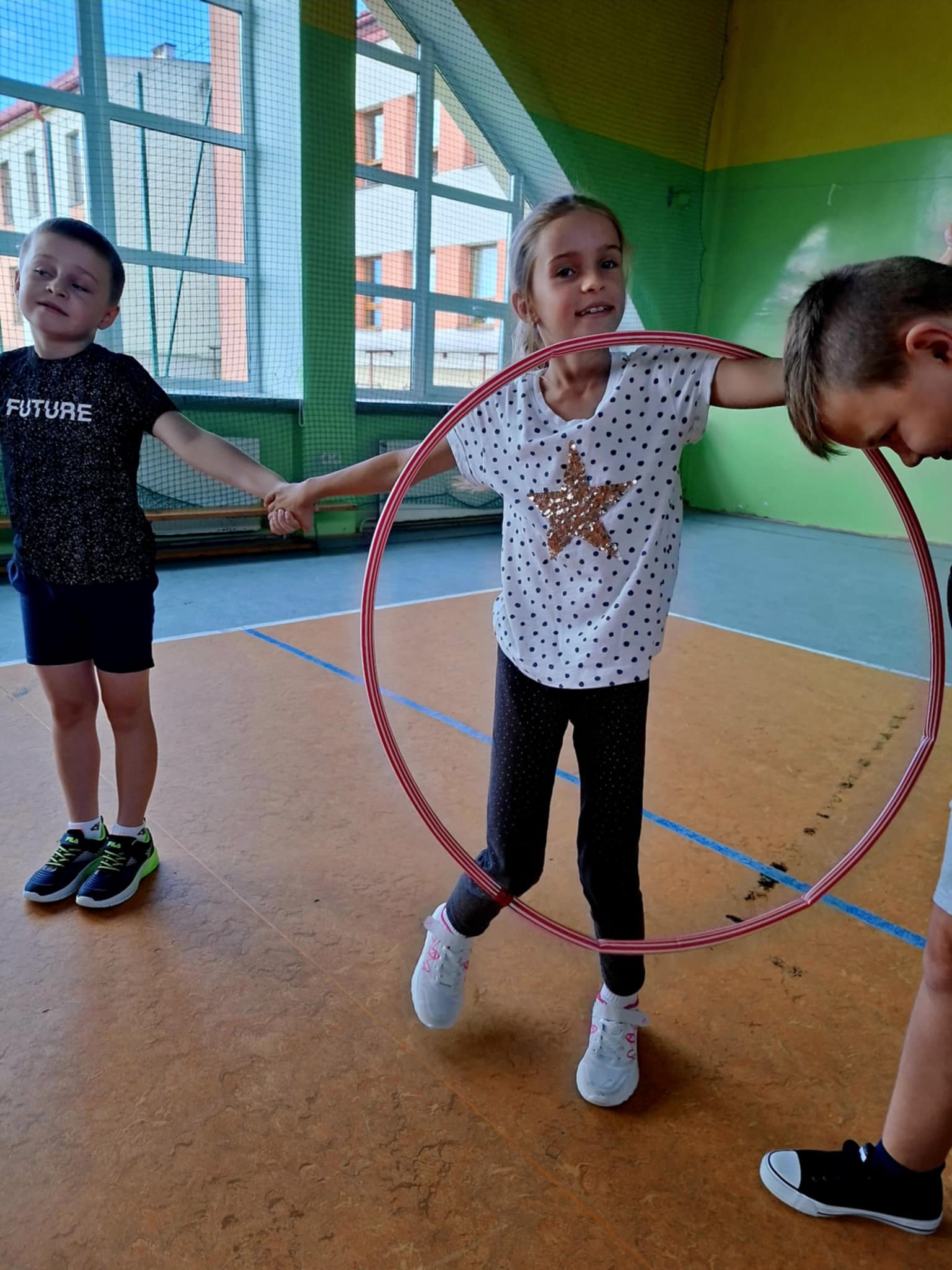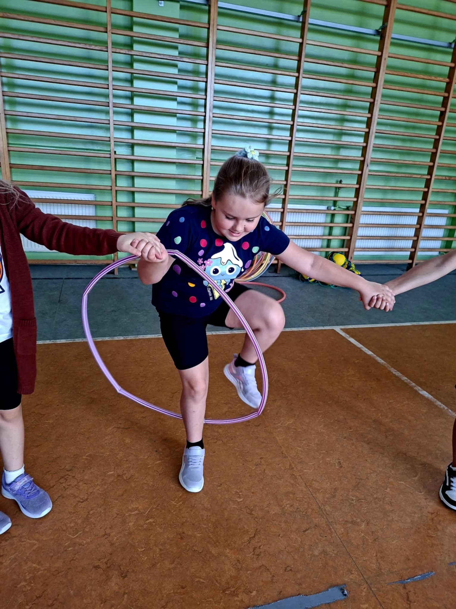 🤸 W ramach zabaw ruchowych uczniowie brali udział w „kropkowych wyścigach”, tańcu z kolorowymi kropkami oraz zabawie „Podaj kropkę”.
