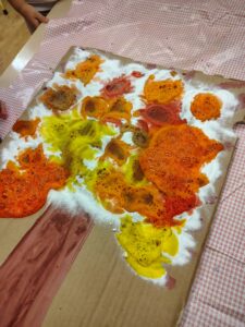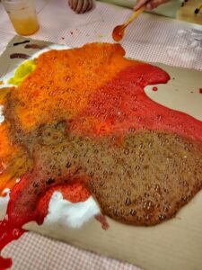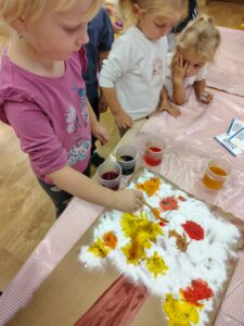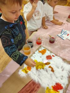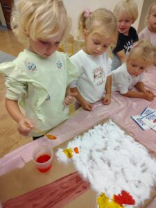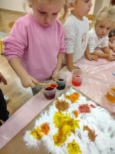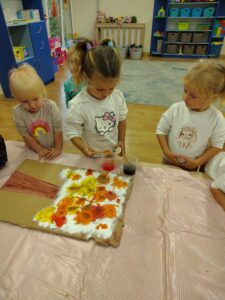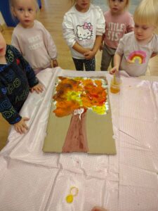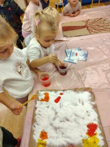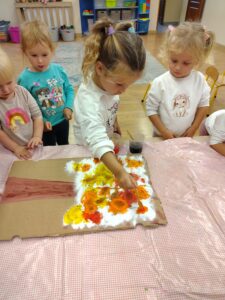 W grupie maluszków rozmawiamy o zmianach jakie zachodzą w przyrodzie jesienną porą, przy tej okazji wzięliśmy udział w niezwykłej, jesiennej zabawie, wykonaliśmy eksperyment „Musujące jesienne drzewo”. Nasze drzewo dosłownie eksplodowało jesiennymi kolorami – było radośnie, ciekawie i bardzo kolorowo!