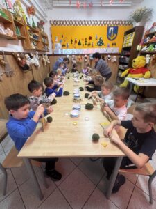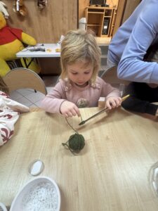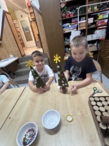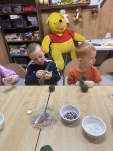Przedszkolaki wykonywały choinki z zielonej włóczki, a następnie z ogromnym zaangażowaniem i kreatywnością ozdabiały je kolorowymi cekinami, pomponami, cyrkoniami i diamencikami.