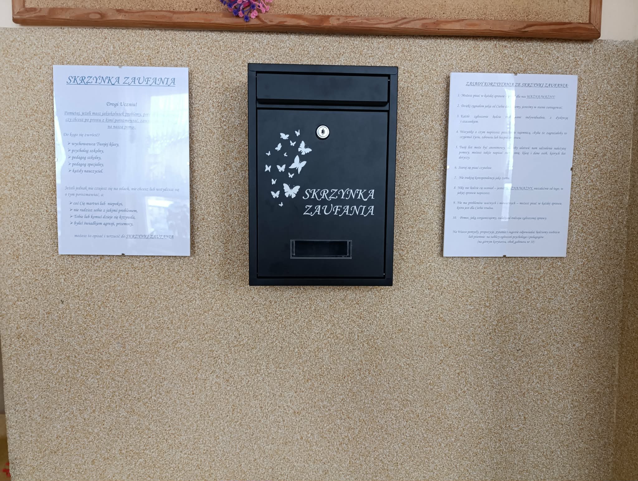 W naszej szkole zostaje uruchomiona Skrzynka Zaufania. Celem inicjatywy jest stworzenie bezpiecznej przestrzeni, w której uczniowie mogą anonimowo dzielić się swoimi problemami, obawami, propozycjami oraz sygnalizować sytuacje wymagające wsparcia (np. trudności w relacjach, przemoc rówieśniczą, hejt, problemy osobiste itp.). Skrzynka znajduje się na dolnym korytarzu w pobliżu sekretariatu i zejścia na świetlicę. Wszystkie zgłoszenia będą traktowane poważnie, z zachowaniem dyskrecji i troski o dobro uczniów. Za analizę wiadomości odpowiada pedagog szkolny/psycholog szkolny/pedagog specjalny. Zachęcamy do korzystania ze Skrzynki Zaufania – Wasz głos jest dla nas bardzo ważny.