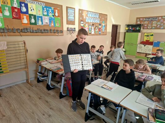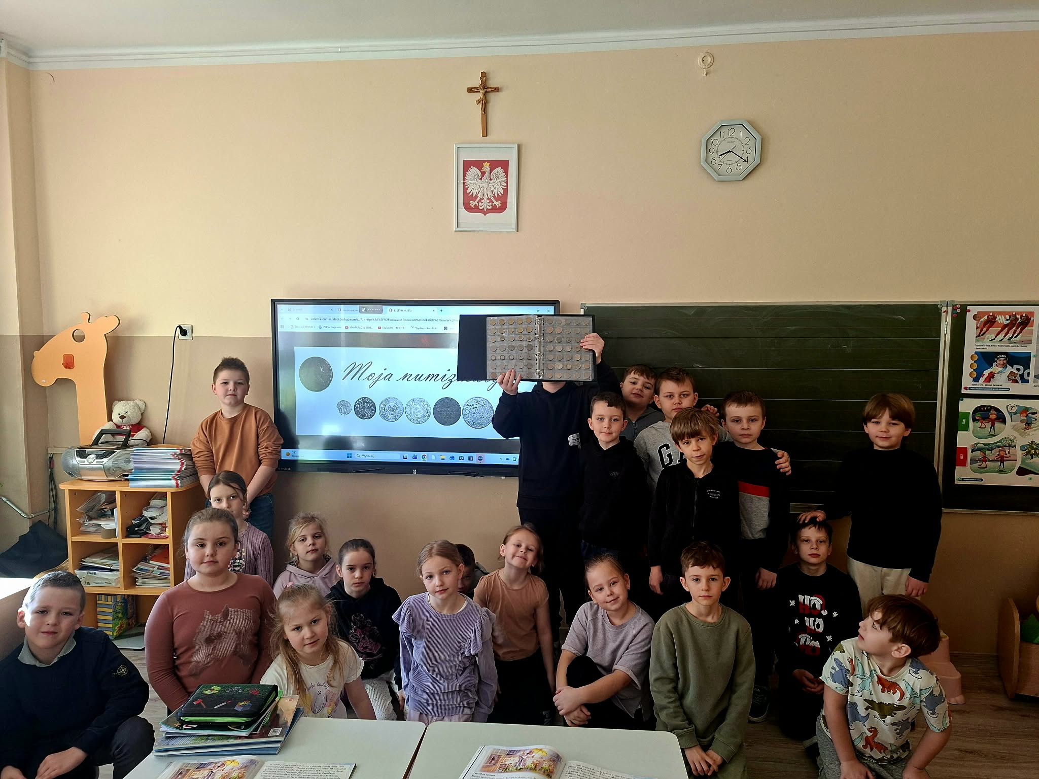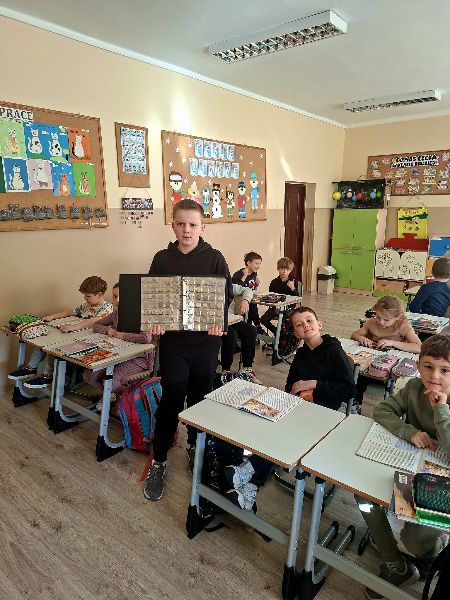 Brat Filip w przystępny i bardzo ciekawy sposób wyjaśnił, na czym polega numizmatyka. Uczniowie dowiedzieli się, jak rozpoznać wartość monety, czym różnią się monety obiegowe od kolekcjonerskich oraz dlaczego niektóre egzemplarze są szczególnie cenne. Nie zabrakło również ciekawostek i pytań ze strony uczniów, którzy z dużym zainteresowaniem oglądali przyniesione eksponaty.