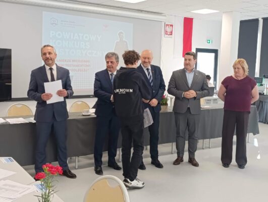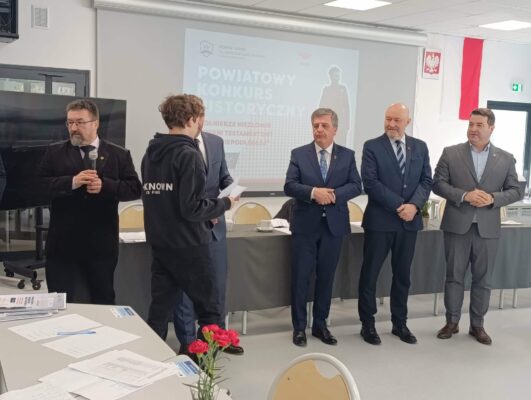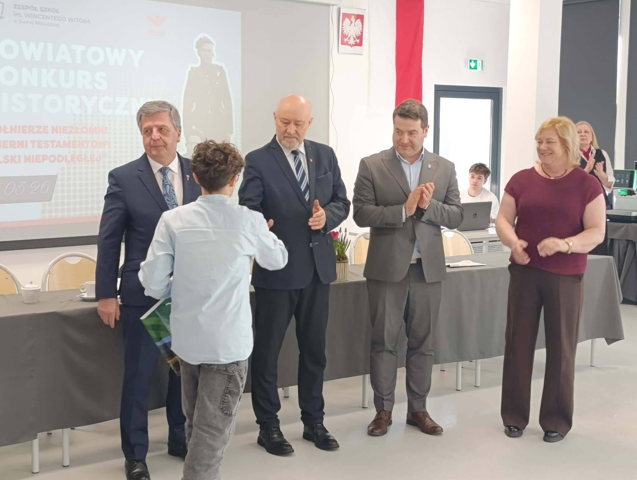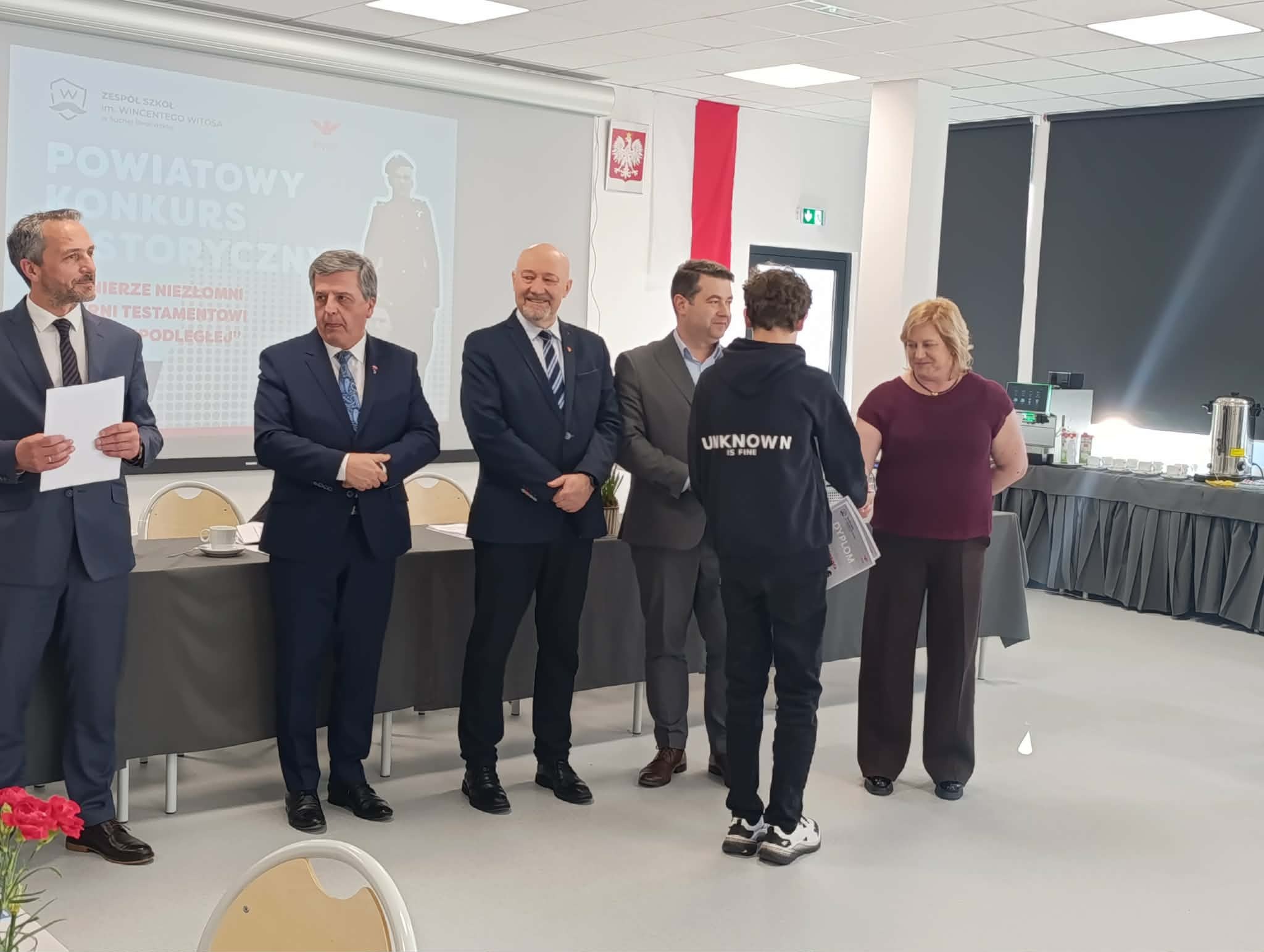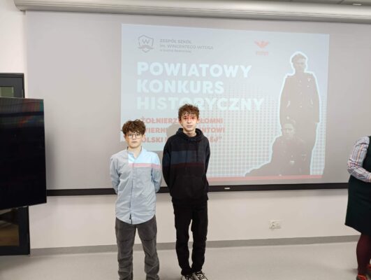 W czwartek (5 marca) uczniowie klasy VIII - Tomasz Lubaszka i Dawid Dittmajer reprezentowali naszą szkołę w Powiatowym Konkursie Historycznym „ŻOŁNIERZE NIEZŁOMNI – WIERNI TESTAMENTOWI POLSKI NIEPODLEGŁEJ”. Celem konkursu było upowszechnianie wiedzy o powojennym podziemiu niepodległościowym oraz kształtowanie postaw patriotycznych wśród młodzieży. Udział w konkursie był dla uczniów cennym doświadczeniem i okazją do pogłębienia zainteresowań historią najnowszą naszego kraju. Uczestnicy mieli okazję sprawdzić swoją wiedzę na temat działalności Żołnierzy Niezłomnych oraz wydarzeń związanych z walką o suwerenność Polski po II wojnie światowej. Cieszymy się, że nasi ósmoklasiści pod opieką p. Ewy Dyrdy rzetelnie przygotowali się do konkursu, a szczególne gratulacje kierujemy do Tomasza, który zakwalifikował się do etapu ustnego i w klasyfikacji końcowej zajął VII miejsce (na 27 uczestników, zarówno ze szkół podstawowych jak i ponadpodstawowych).