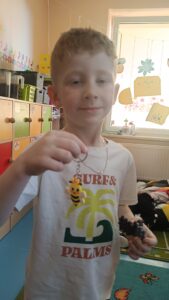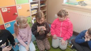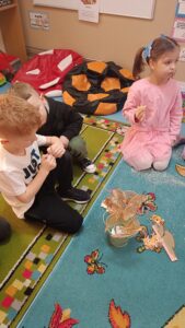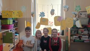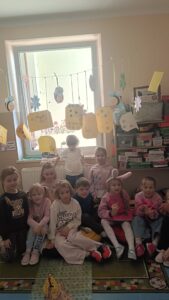 Rozmawialiśmy o znaczeniu pszczół w przyrodzie i wartościach zdrowotnych miodu. W części plastycznej dzieci wykonały plastry miodu, którymi udekorowaliśmy salę, oraz uczestniczyły w zabawach usprawniających motorykę małą – przypinając pszczółki do plastrów.