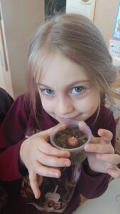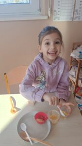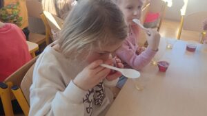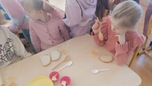 Dzieci przygotowywały kanapki z miodem lipowym, akacjowym, nektarowym i malinowym. Samodzielnie smarowały pieczywo, poznając smak, zapach i konsystencję różnych rodzajów miodu. Następnie zaparzyliśmy herbatę z dzikiej róży, herbatę z dodatkiem kakaowca oraz obserwowaliśmy kwiat herbaciany. Dzieci wąchały napary i słodziły je miodem.