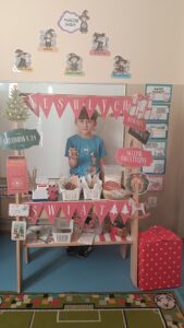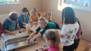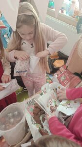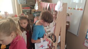 Dziś w naszym przedszkolu grupa Sówki wypiekały pierniki – wycinała kształty foremkami, ozdabiała je i świetnie się przy tym bawiła. Dzieci otworzyły też mały sklep świąteczny, w którym sprzedawały pierniki i mleko, wcielając się w rolę sprzedawców. Podczas zajęć rozwijały umiejętności kulinarne, matematyczne, społeczne i językowe.