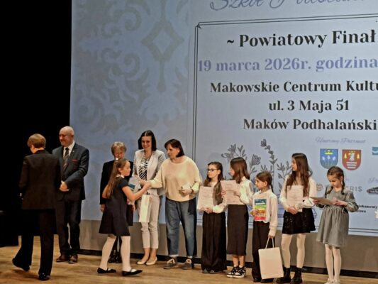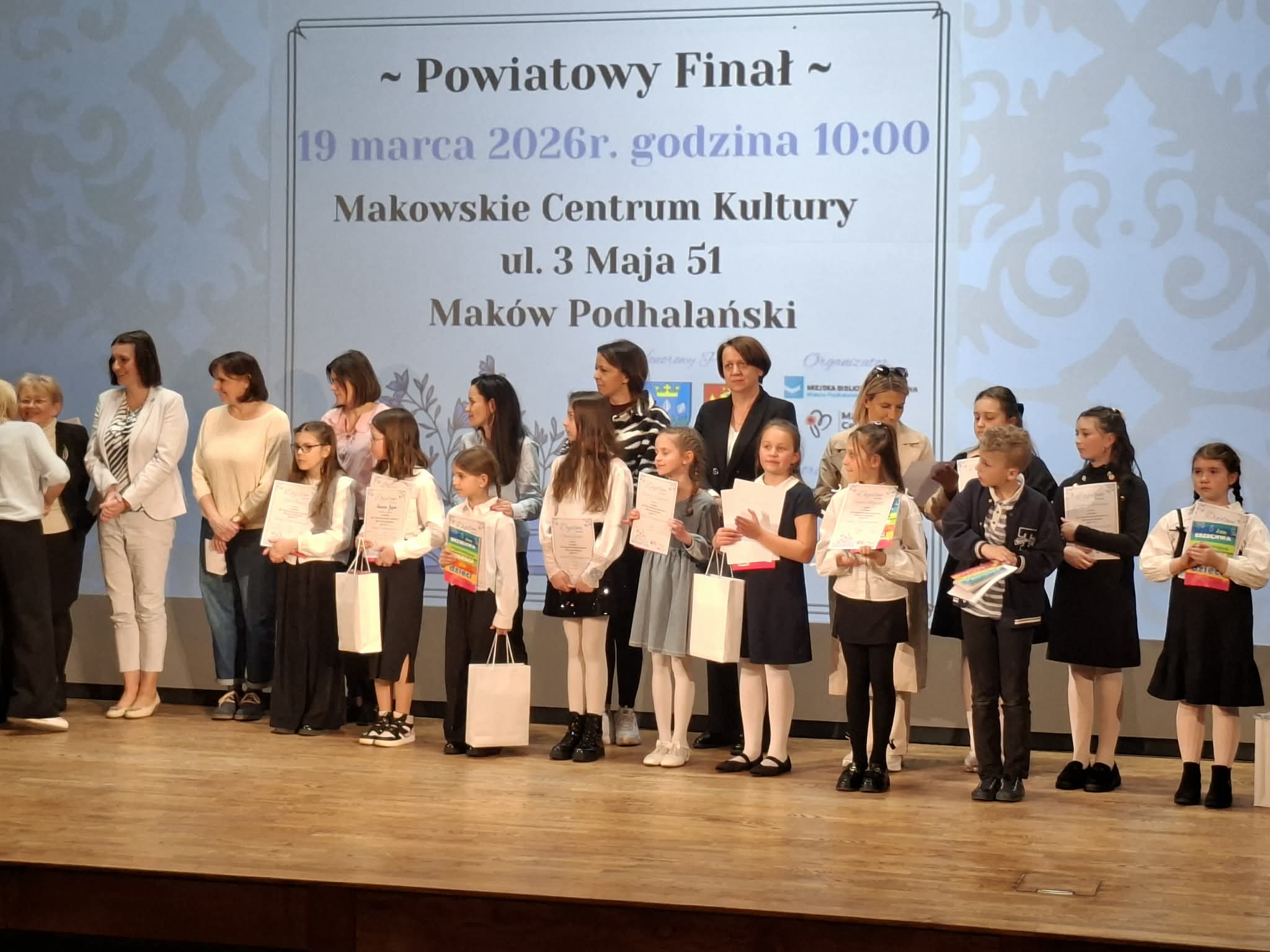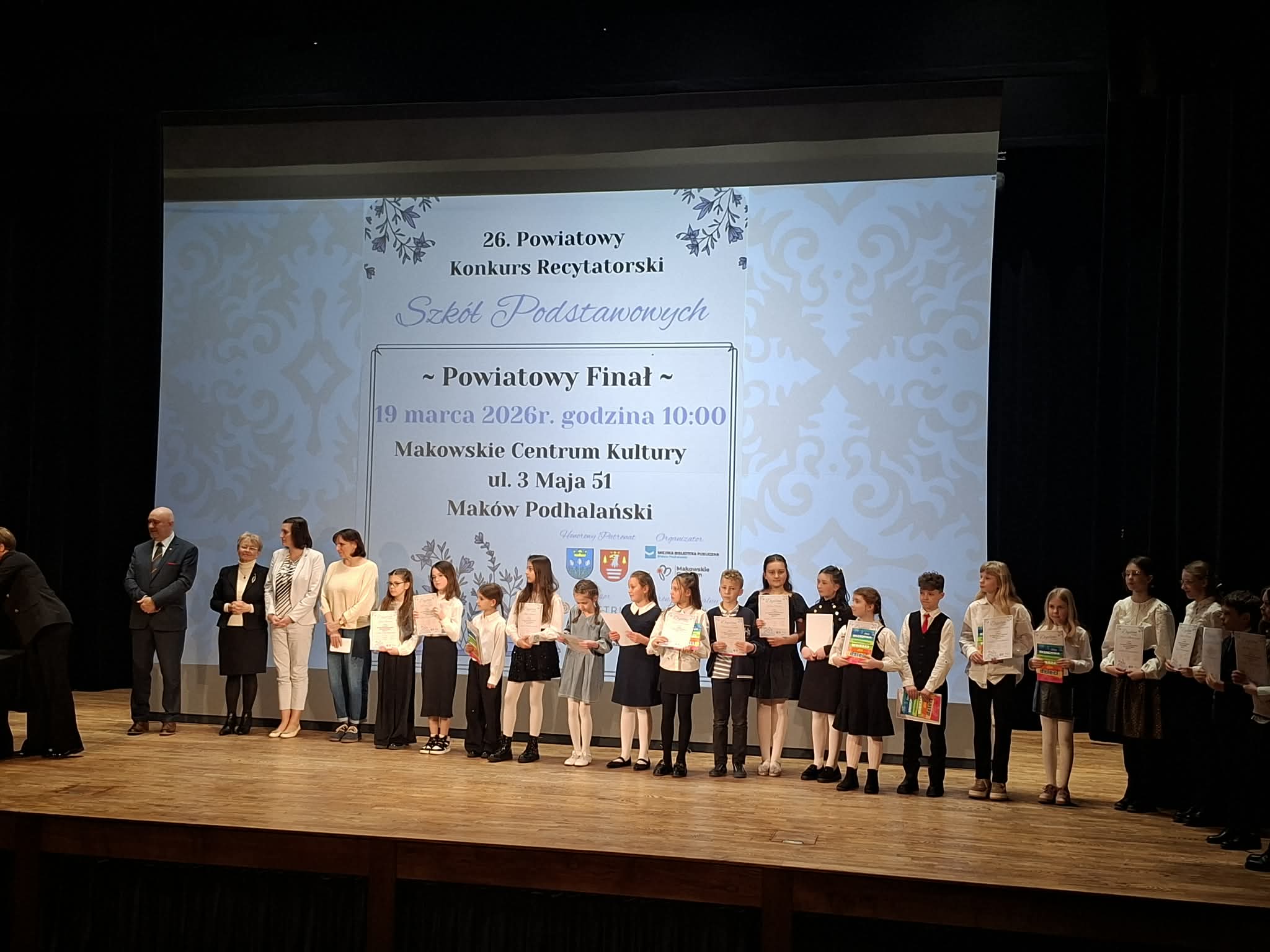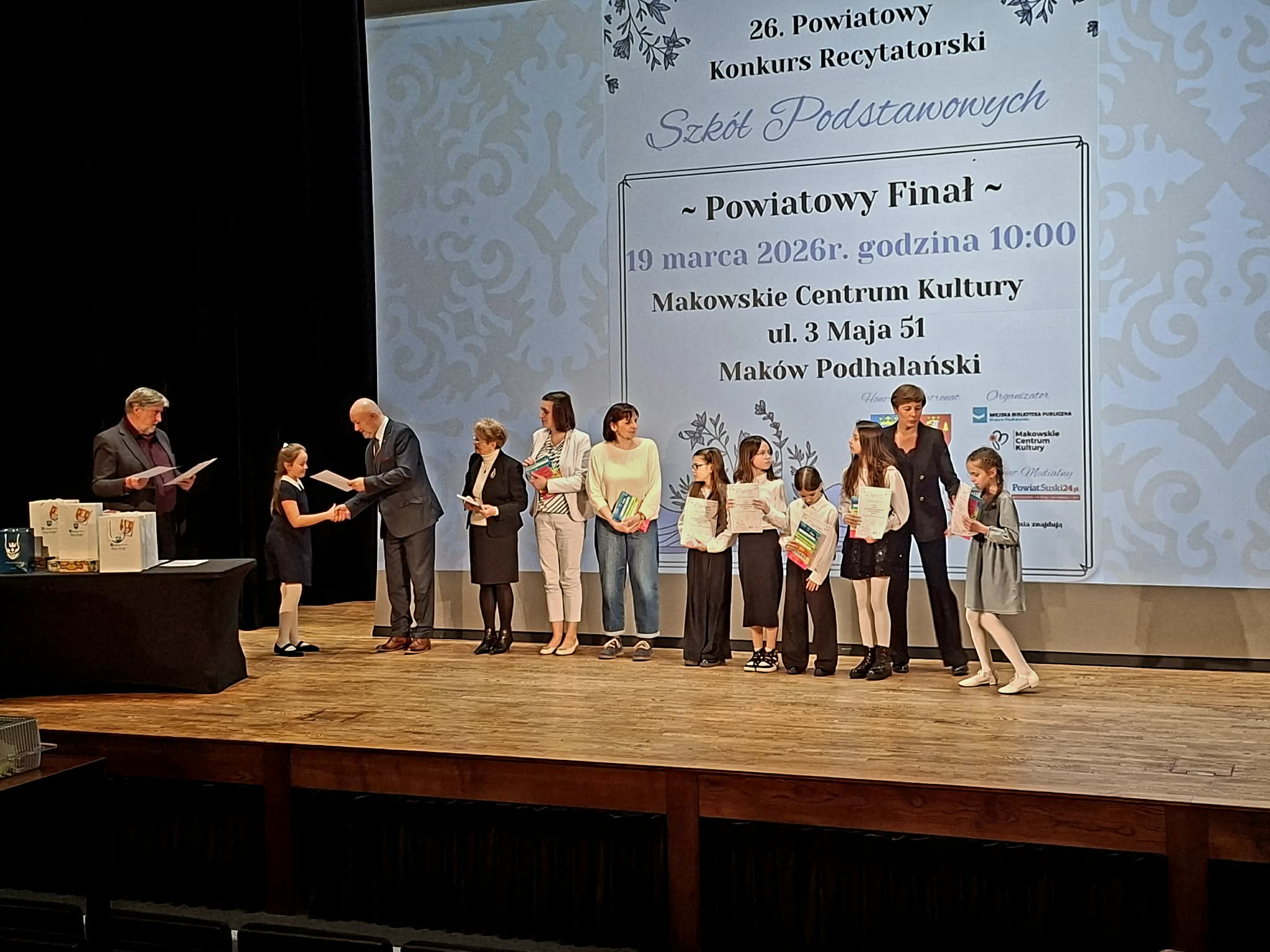 Dnia 19 marca 2026 r. w Makowskim Centrum Kultury w Makowie Podhalańskim odbył się finał 26. Powiatowego Konkursu Recytatorskiego Szkół Podstawowych dla uczniów klas 0–5. Wybrani w eliminacjach przedstawiciele każdej z gmin naszego powiatu stanęli w szranki w dwóch kategoriach: klas 0 – 2 i klas 3 – 5.