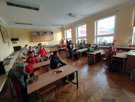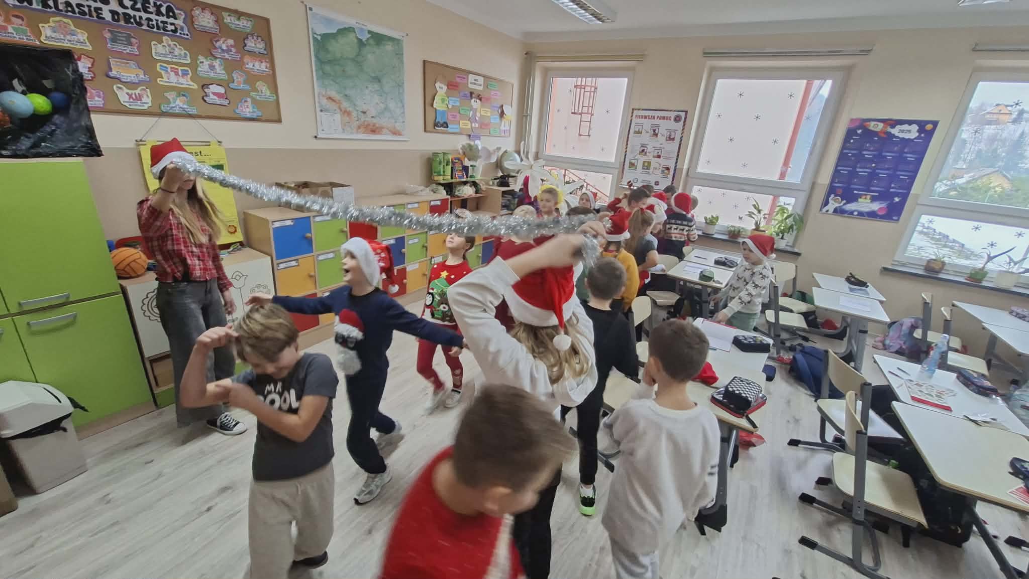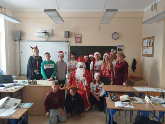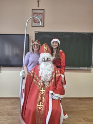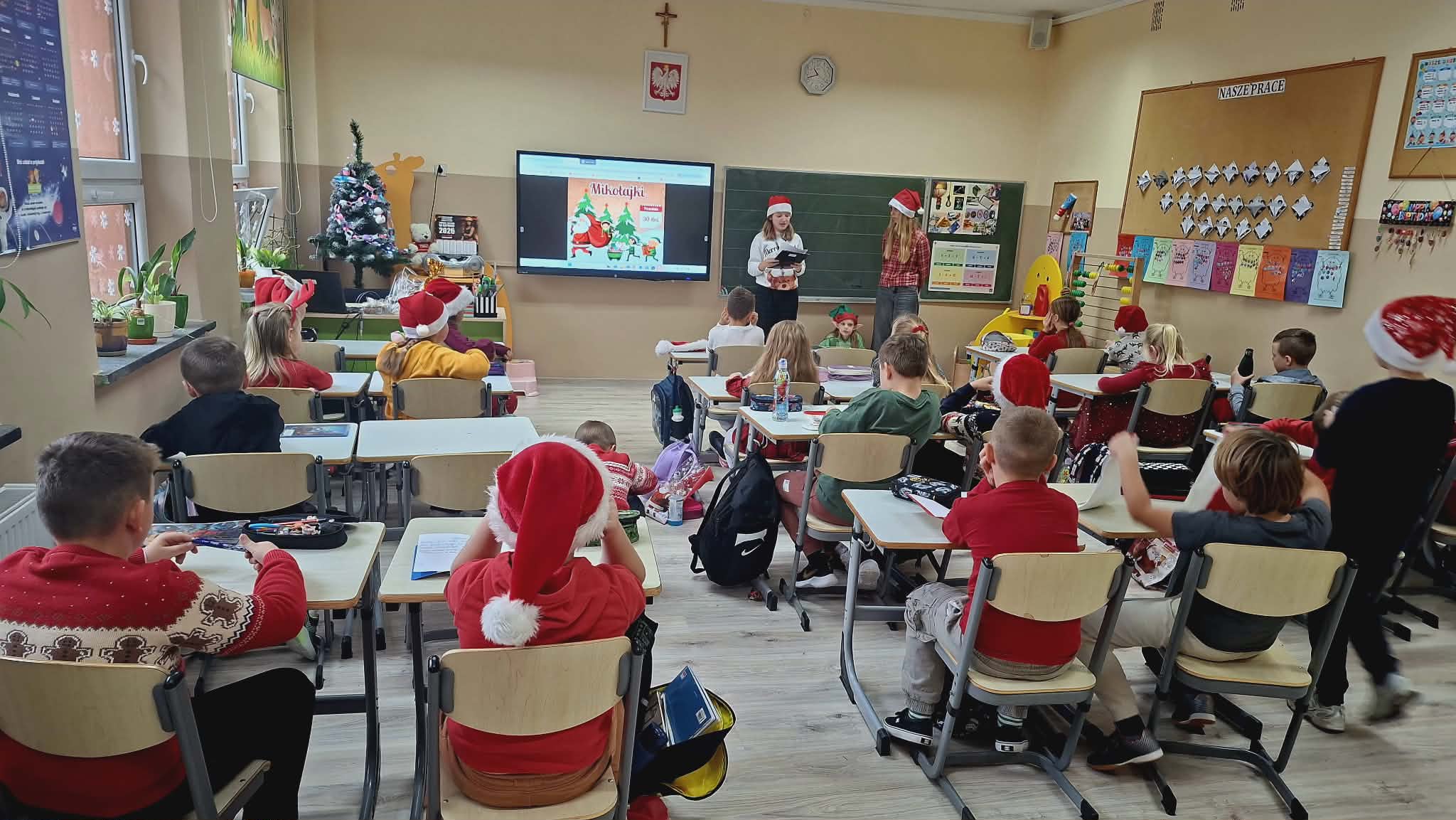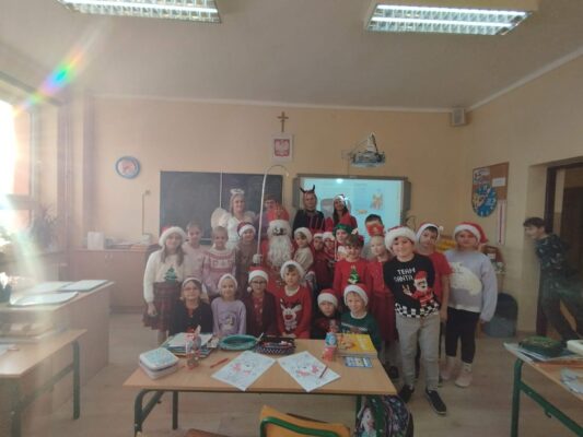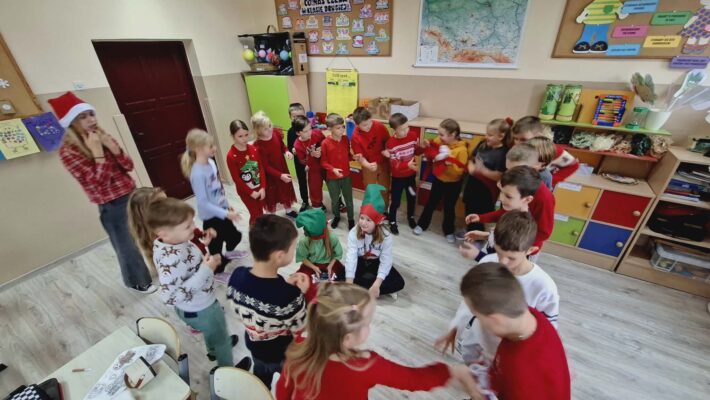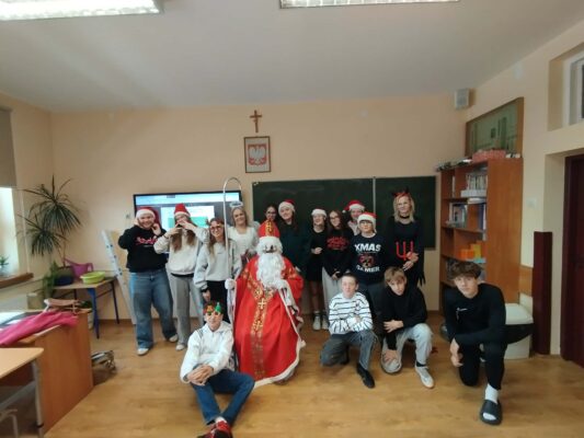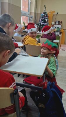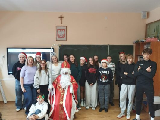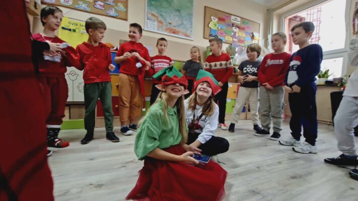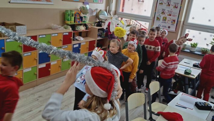 Dziś od samego rana uczniowie mogli poczuć wyjątkową, mikołajkową atmosferę – korytarze i sale lekcyjne ozdobiono świątecznymi dekoracjami, a w klasach pojawiły się czerwone czapki i uśmiechnięte buzie.