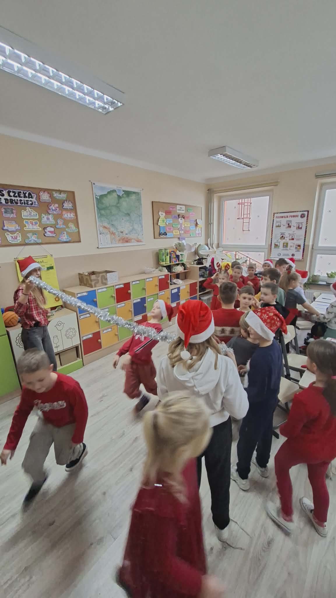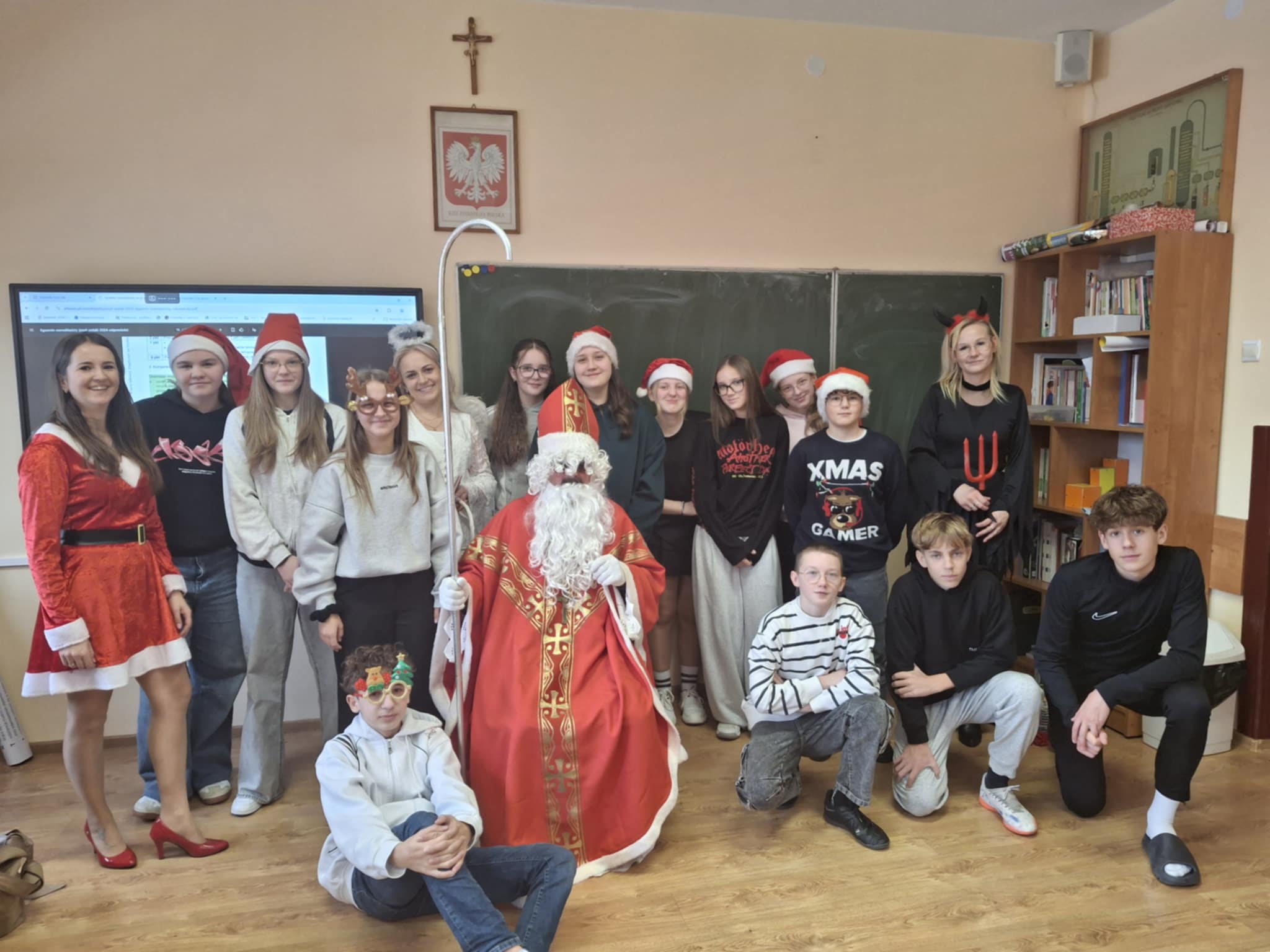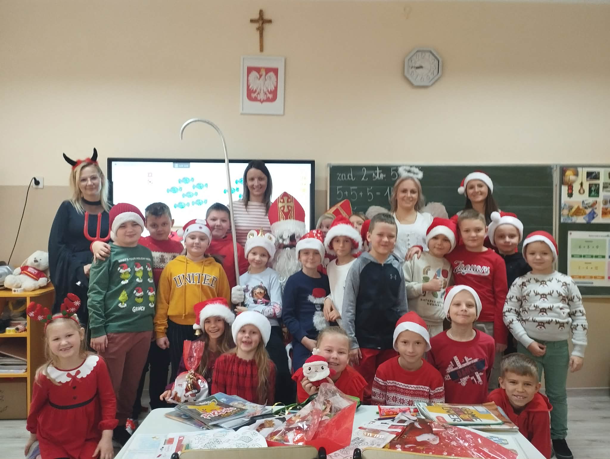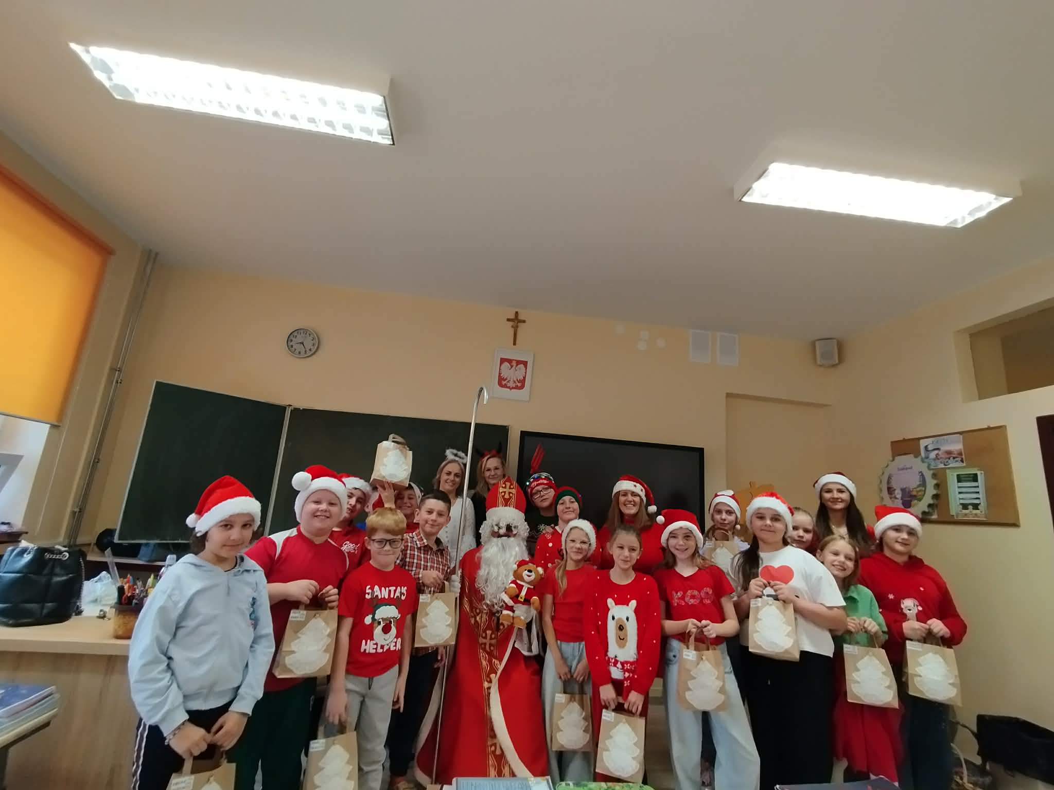Dziś od samego rana uczniowie mogli poczuć wyjątkową, mikołajkową atmosferę – korytarze i sale lekcyjne ozdobiono świątecznymi dekoracjami, a w klasach pojawiły się czerwone czapki i uśmiechnięte buzie.