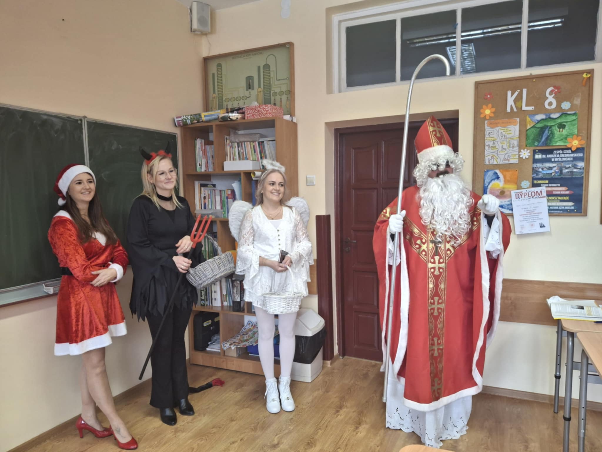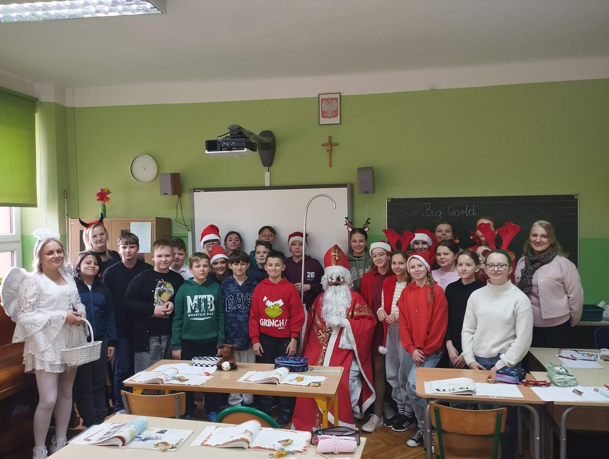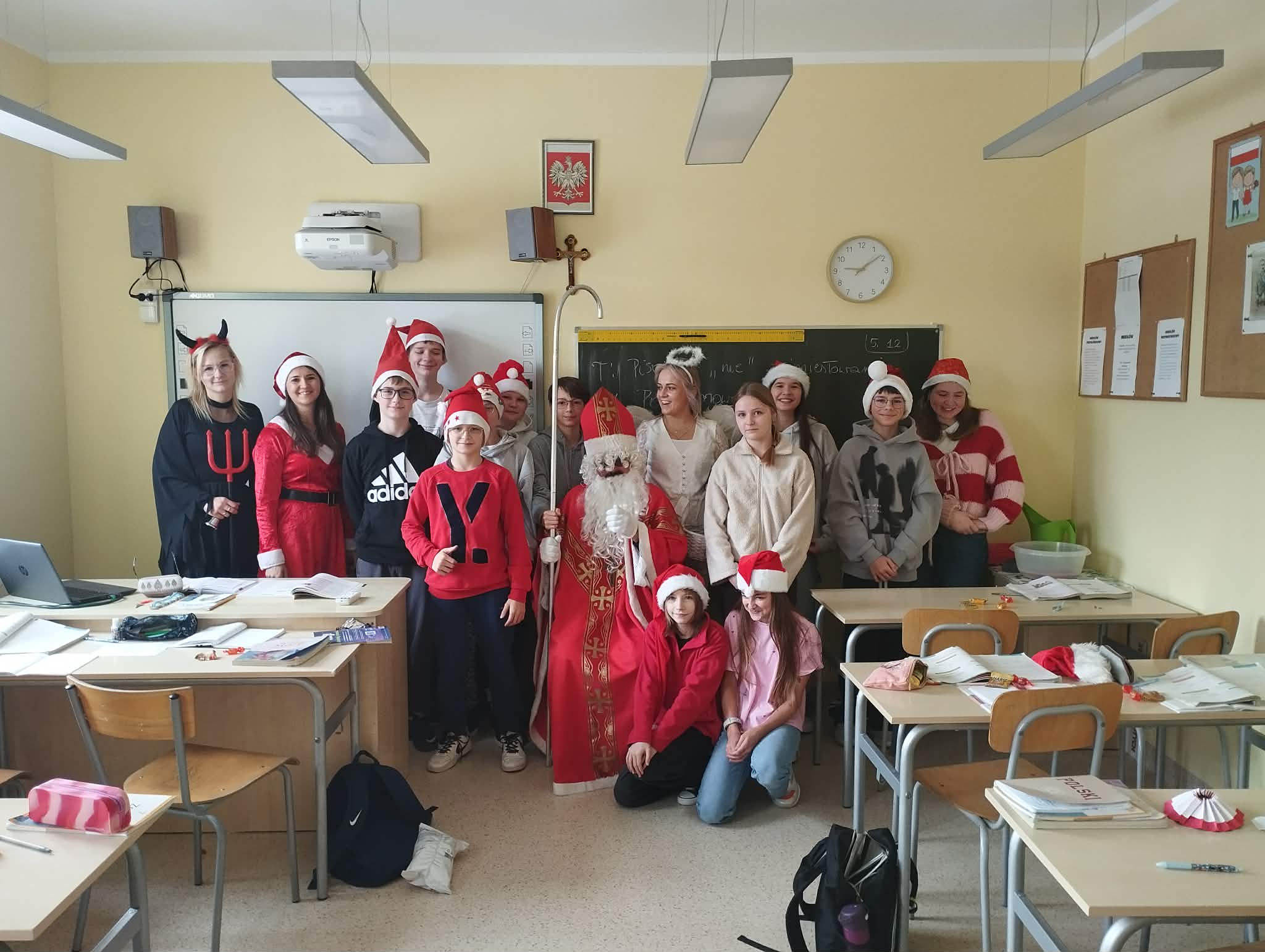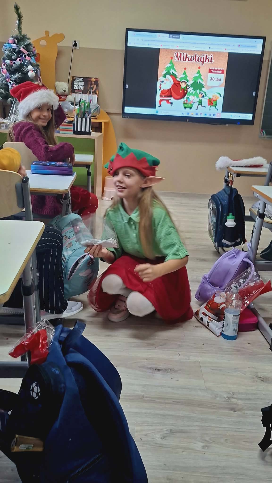 Dziś od samego rana uczniowie mogli poczuć wyjątkową, mikołajkową atmosferę – korytarze i sale lekcyjne ozdobiono świątecznymi dekoracjami, a w klasach pojawiły się czerwone czapki i uśmiechnięte buzie.