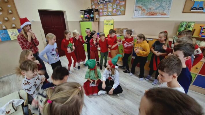 Największą atrakcją była oczywiście wizyta Świętego Mikołaja, który wraz ze swoimi pomocnikami odwiedził wszystkie klasy. Każdy uczeń otrzymał słodki upominek, a starsze koleżanki – Magdalena Kowalczyk i Hanna Lubaszka przygotowały dla najmłodszych konkursy i zabawy integracyjne. Dzięki ich pomysłowości najmłodsi mogli spędzić ten dzień w atmosferze radości i wspólnej zabawy. W rolę tajemniczego elfa, który słodkościami obdarzył grono pedagogiczne i wszystkich pracowników szkoły, wcieliła się Ania Kowalczyk z klasy 3.