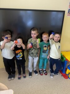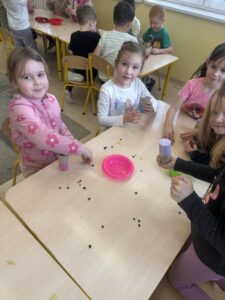 tworzyły własne grzechotki z rolek po papierze toaletowym, balonów, ziaren kawy oraz makaronu – poznając różnorodność brzmień i rozwijając kreatywność,
