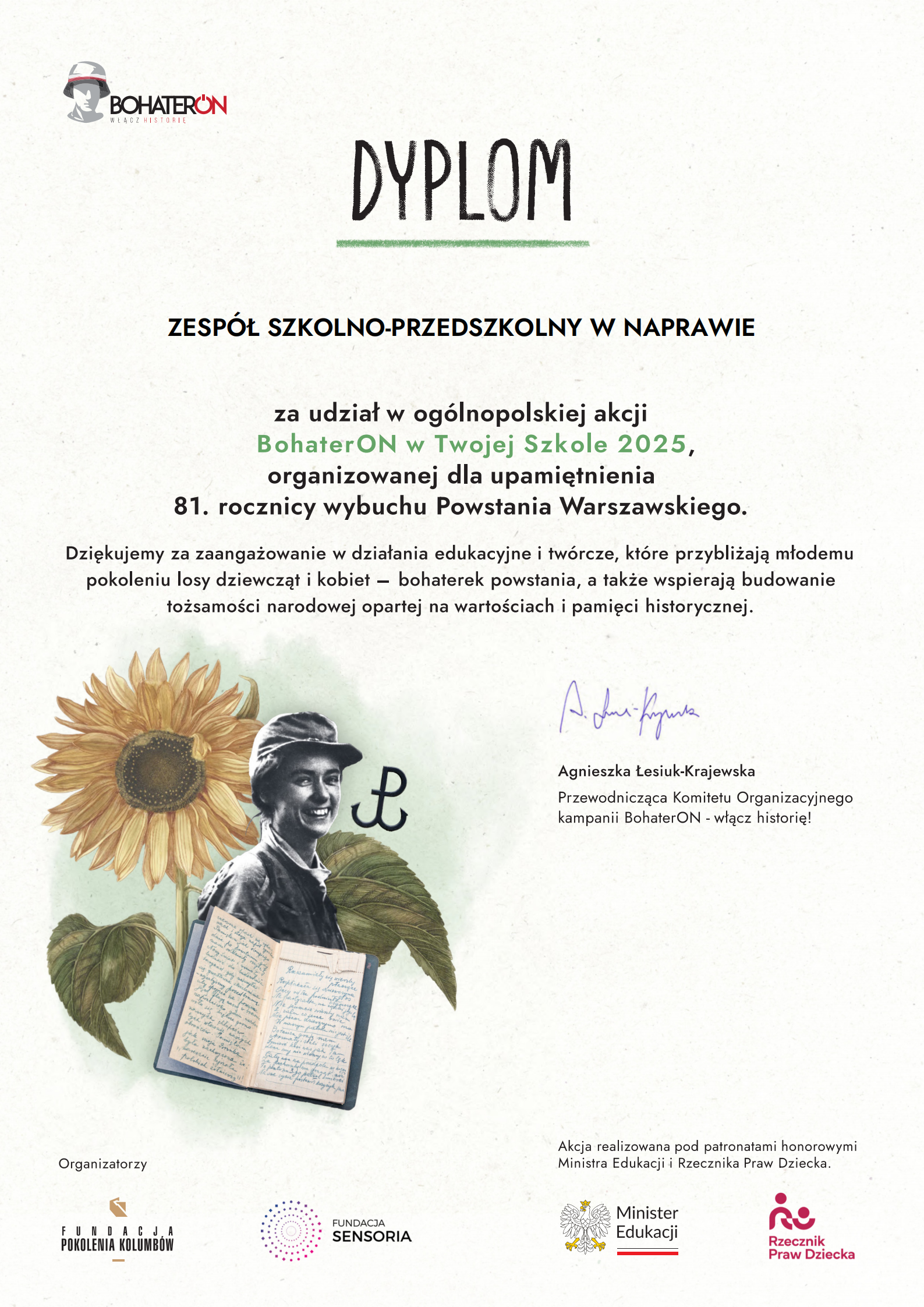 Udział w akcji BohaterON pozwolił uczniom lepiej zrozumieć znaczenie wolności i pamięci historycznej oraz uświadomił, jak istotne jest pielęgnowanie narodowego dziedzictwa. Za zaangażowanie i aktywny udział szkoła otrzymała dyplom z podziękowaniem.