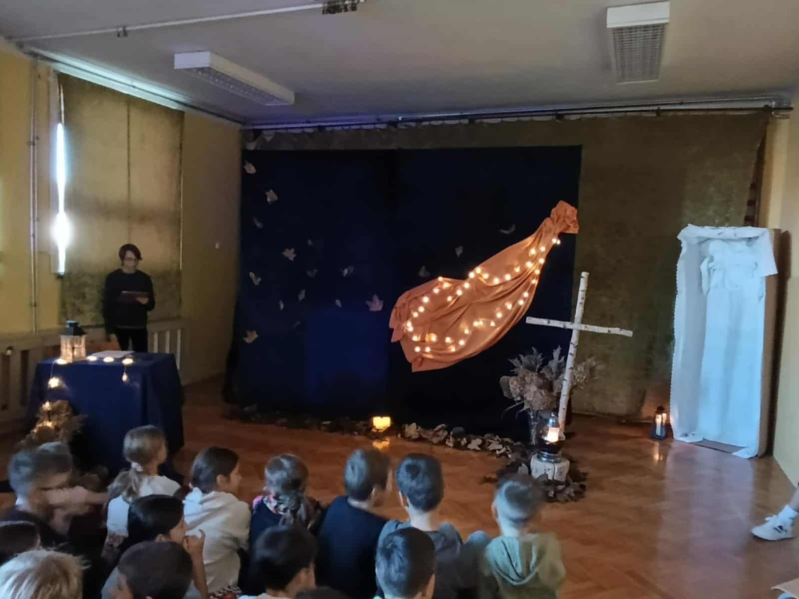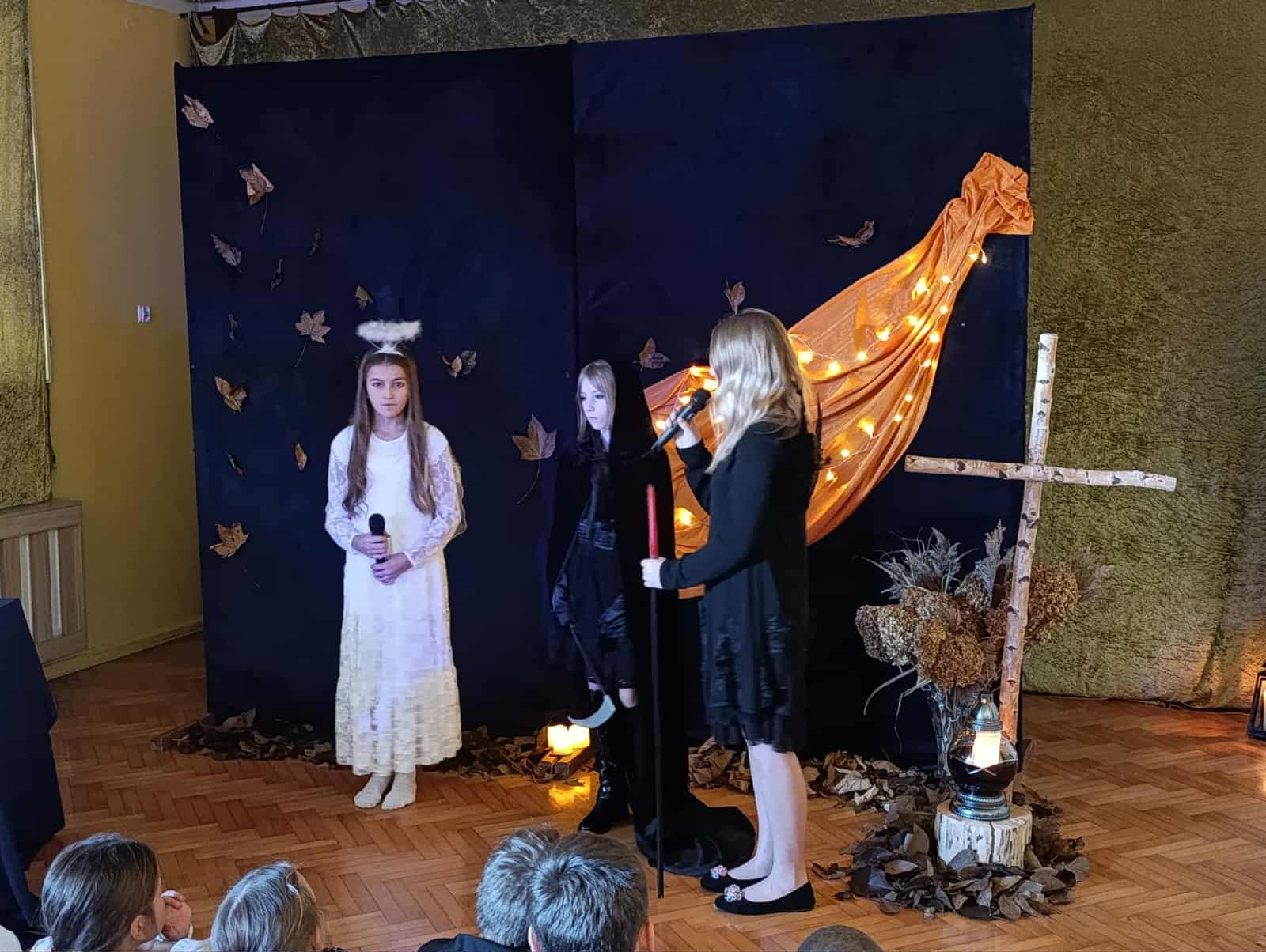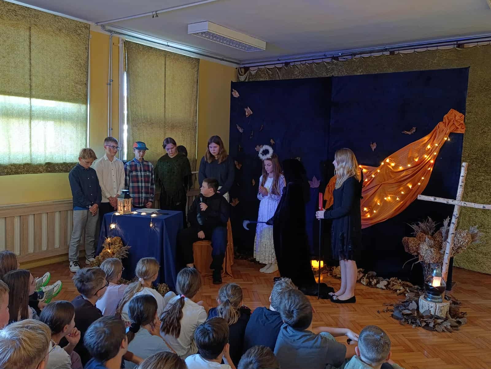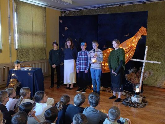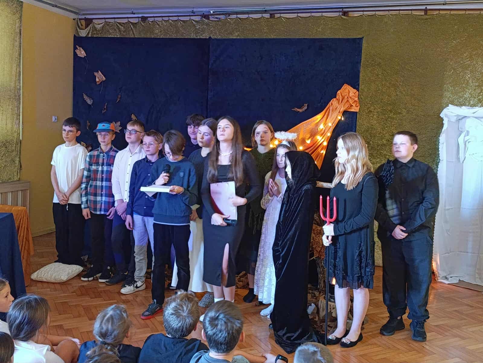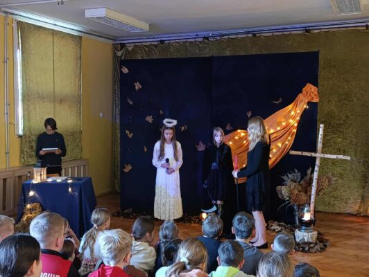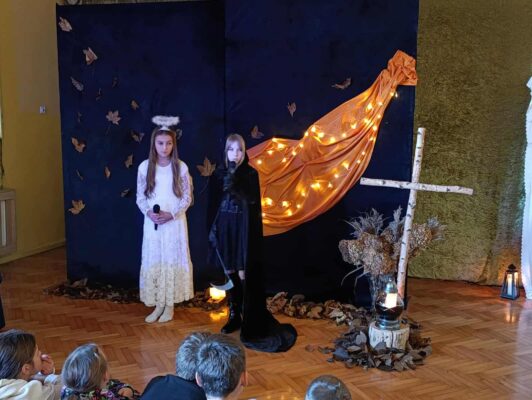 z okazji zbliżającej się uroczystości Wszystkich Świętych. Wspominaliśmy także bliskich zmarłych i tych, którzy oddali życie za naszą Ojczyznę. Spotkaliśmy się dzisiaj, aby pobyć przez chwilę w zadumie nad przemijaniem oraz wspomnieć tych, których już z nami nie ma. To ważne, abyśmy zawsze o nich pamiętali. W autorskim montażu słowno-muzycznym, który opracowała Martyna Koza, a przygotowali uczniowie VII klasy, wiersz przeplatał się z muzyką, narracja – z trudnymi życiowymi przeżyciami. Aniołowie uosabiali pamięć o zmarłych, a śmierć nie wzbudzała strachu. W podsumowaniu pojawiło się stwierdzenie, iż przemijanie człowieka jest czymś naturalnym, a dopóty żyjemy, dopóki pamiętamy i kochamy.