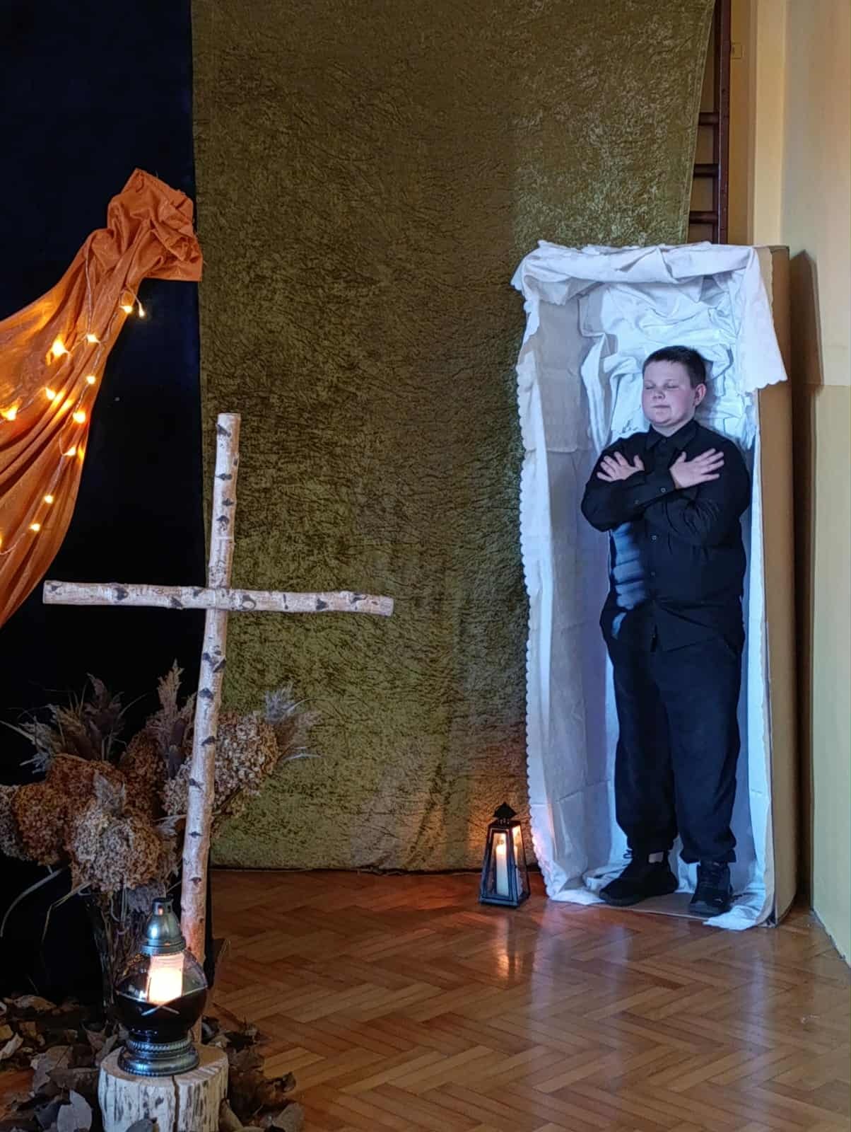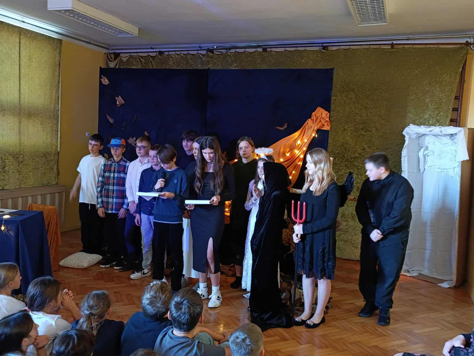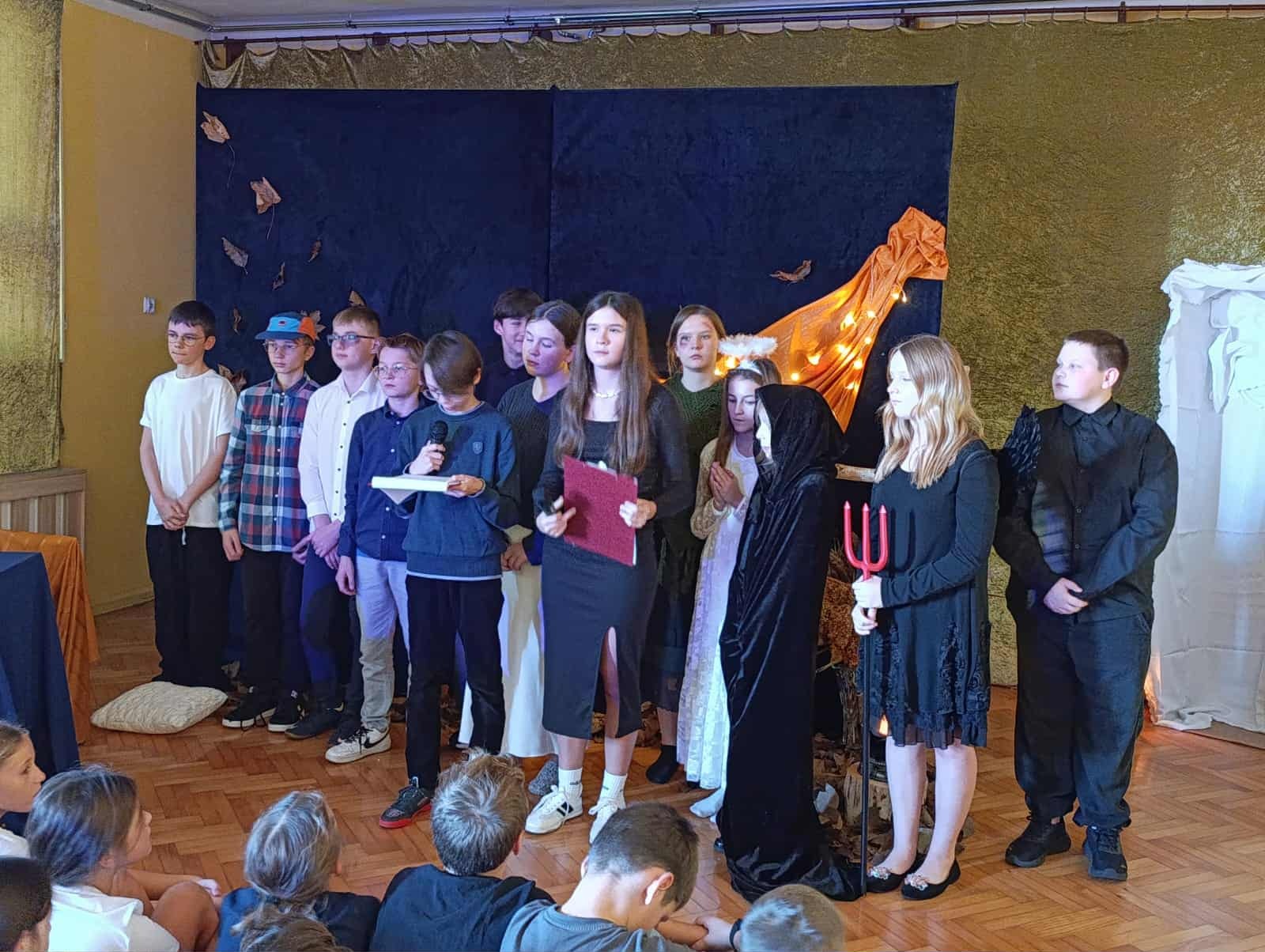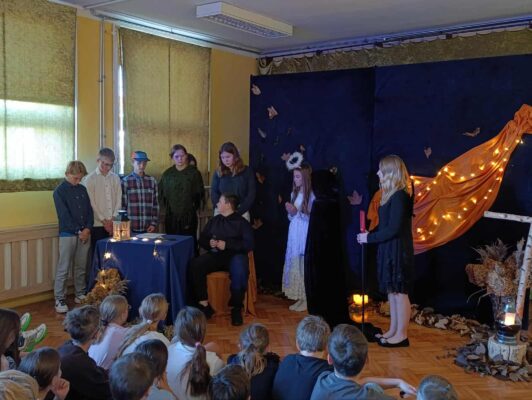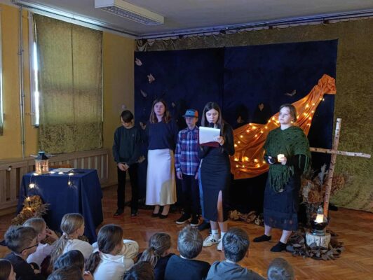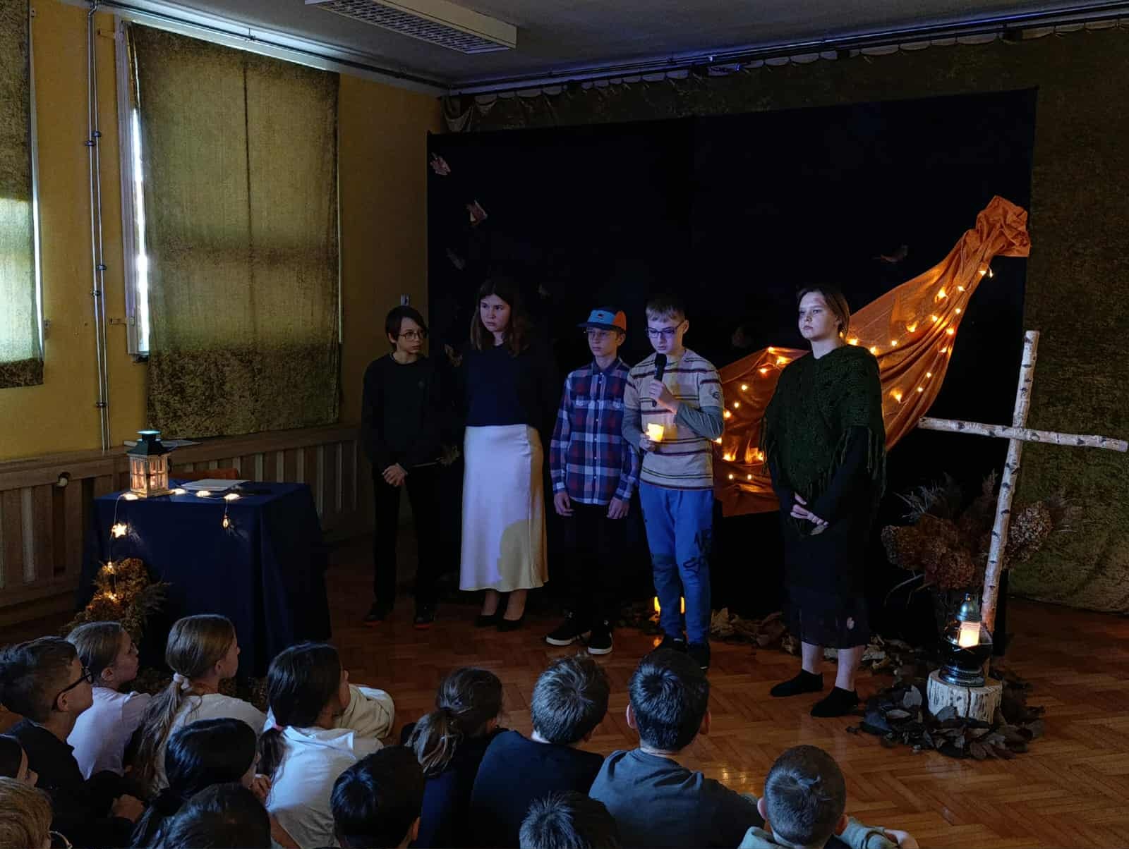 z okazji zbliżającej się uroczystości Wszystkich Świętych. Wspominaliśmy także bliskich zmarłych i tych, którzy oddali życie za naszą Ojczyznę. Spotkaliśmy się dzisiaj, aby pobyć przez chwilę w zadumie nad przemijaniem oraz wspomnieć tych, których już z nami nie ma. To ważne, abyśmy zawsze o nich pamiętali. W autorskim montażu słowno-muzycznym, który opracowała Martyna Koza, a przygotowali uczniowie VII klasy, wiersz przeplatał się z muzyką, narracja – z trudnymi życiowymi przeżyciami. Aniołowie uosabiali pamięć o zmarłych, a śmierć nie wzbudzała strachu. W podsumowaniu pojawiło się stwierdzenie, iż przemijanie człowieka jest czymś naturalnym, a dopóty żyjemy, dopóki pamiętamy i kochamy.