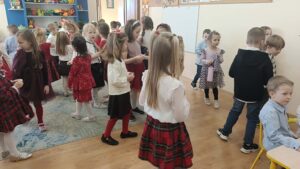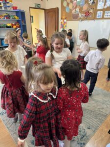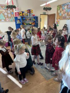 Jednym z najważniejszych momentów spotkania było wspólne łamanie się opłatkiem. Dzieci i nauczyciele składali sobie nawzajem serdeczne życzenia – zdrowia, radości i spełnienia marzeń. Ten piękny gest był dla przedszkolaków lekcją empatii, szacunku i otwartości na drugiego człowieka.