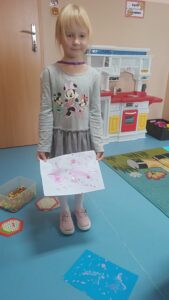 „Kolorowy deszcz” – praca plastyczna, w której kolorowe krople farby spływały po kartce, mieszając się w tęczowe wzory.