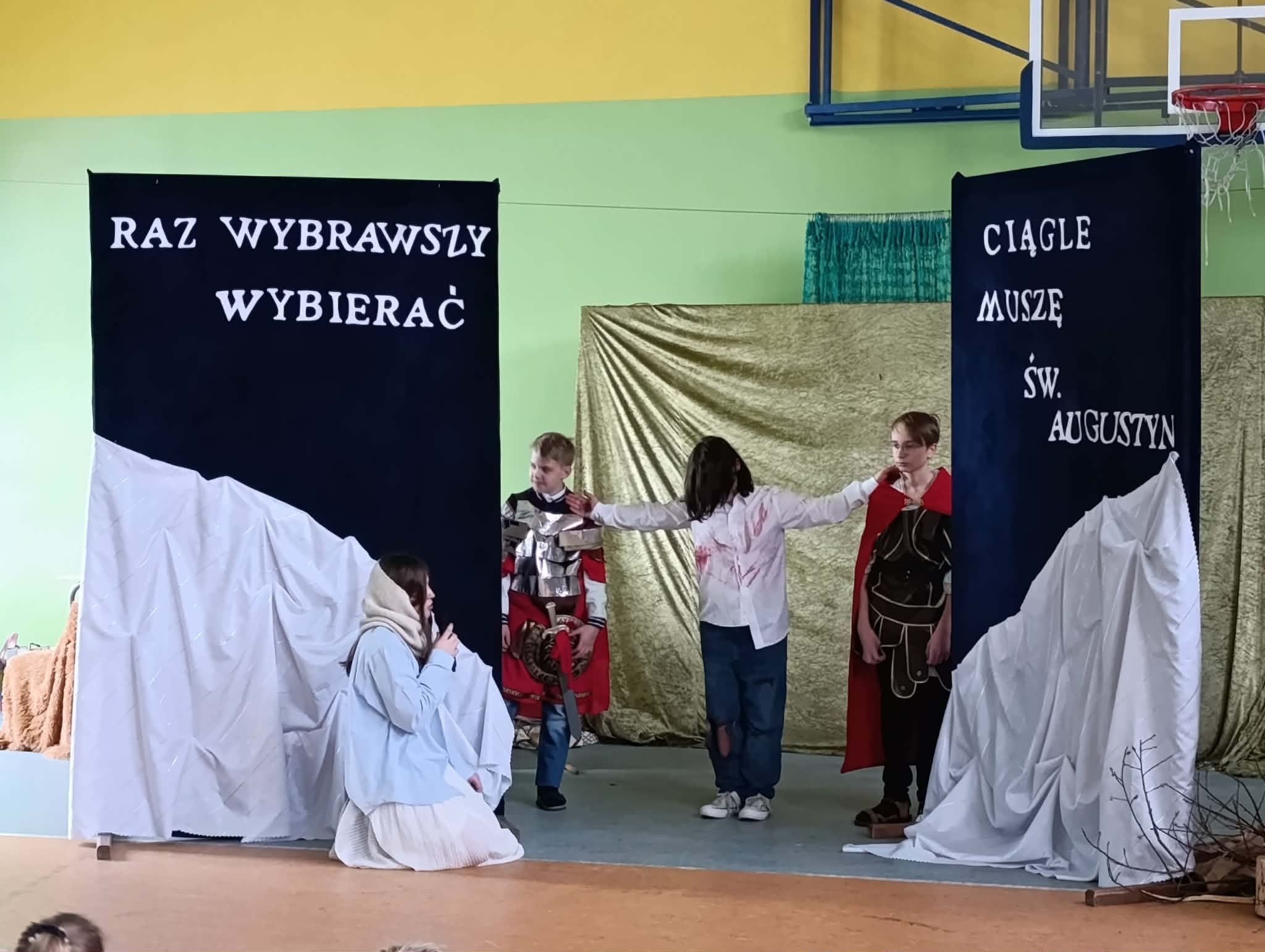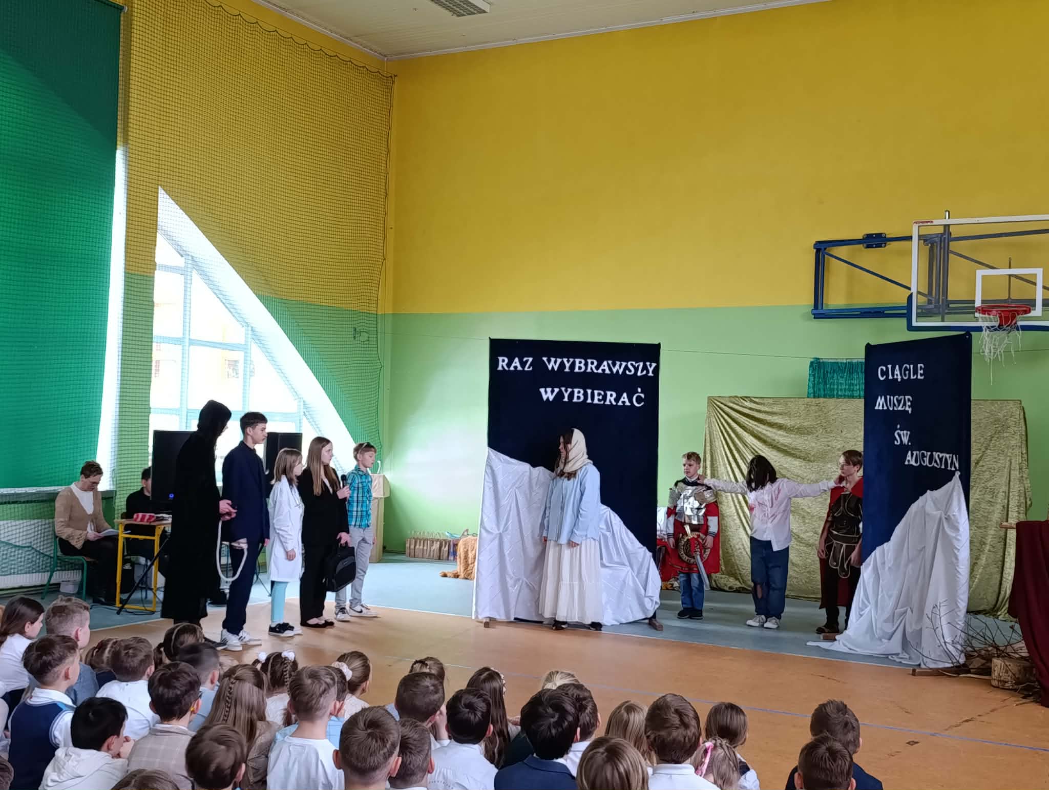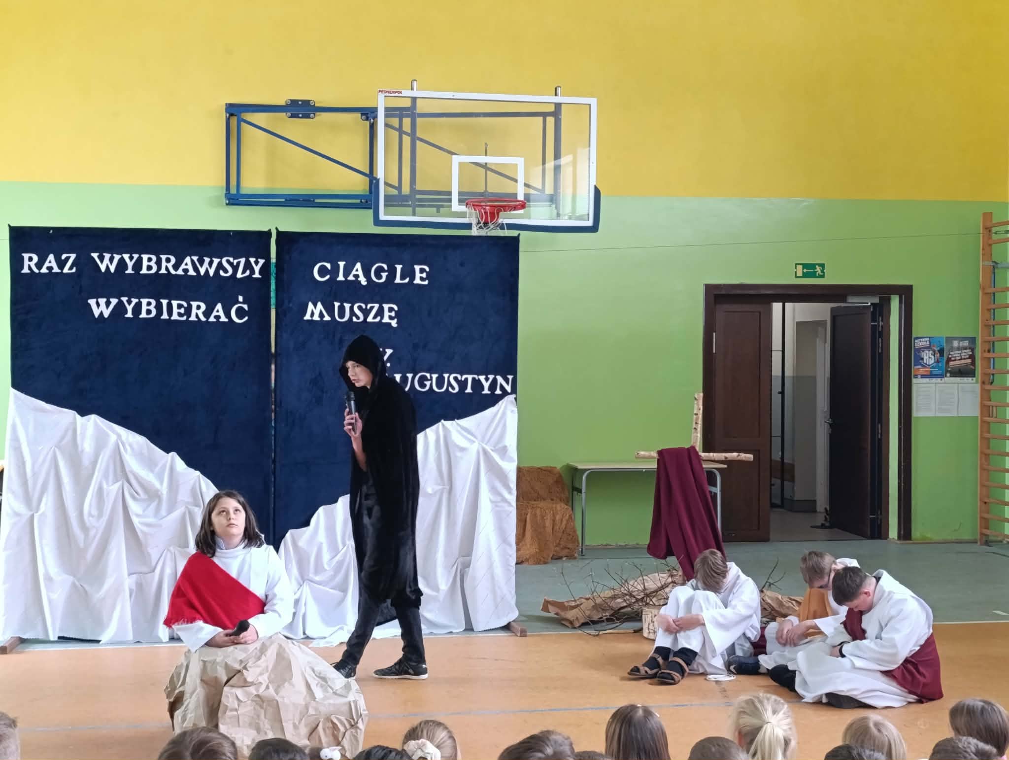 Dnia 1 kwietnia 2026 r. w naszej szkole odbyło się uwspółcześnione misterium Męki Pańskiej przygotowane przez uczniów klasy VII (gościnnie wystąpił Józef Kołodziej i Gabriel Krawczyk z kl. VI), które wprowadziło nas w klimat Triduum Paschalnego oraz Świąt Wielkanocnych. Myśl przewodnią stanowił cytat św. Augustyna „Raz wybrawszy, ciągle wybierać muszę”. Historia skazanego Jezusa Chrystusa, w którego rolę wcielił się Karol Kurek z kl. V, znalazła swój finał w sądzie, gdzie kolejno powoływani świadkowie zeznawali przeciwko Nazarejczykowi. Sędzina wydała ostateczny wyrok - karę śmierci i to na krzyżu. Biblijna Golgota przeplatała się więc z naszą rzeczywistością. Ludzie ciągle muszą dokonywać wyboru. W spektaklu głosem sumienia z jednej strony był anioł, z drugiej – szatan. Ostateczne decyzje zawsze podejmował człowiek. Całość uzupełniała symboliczna dekoracja, którą przygotowała p. U. Harwat oraz przejmująca muzyka.