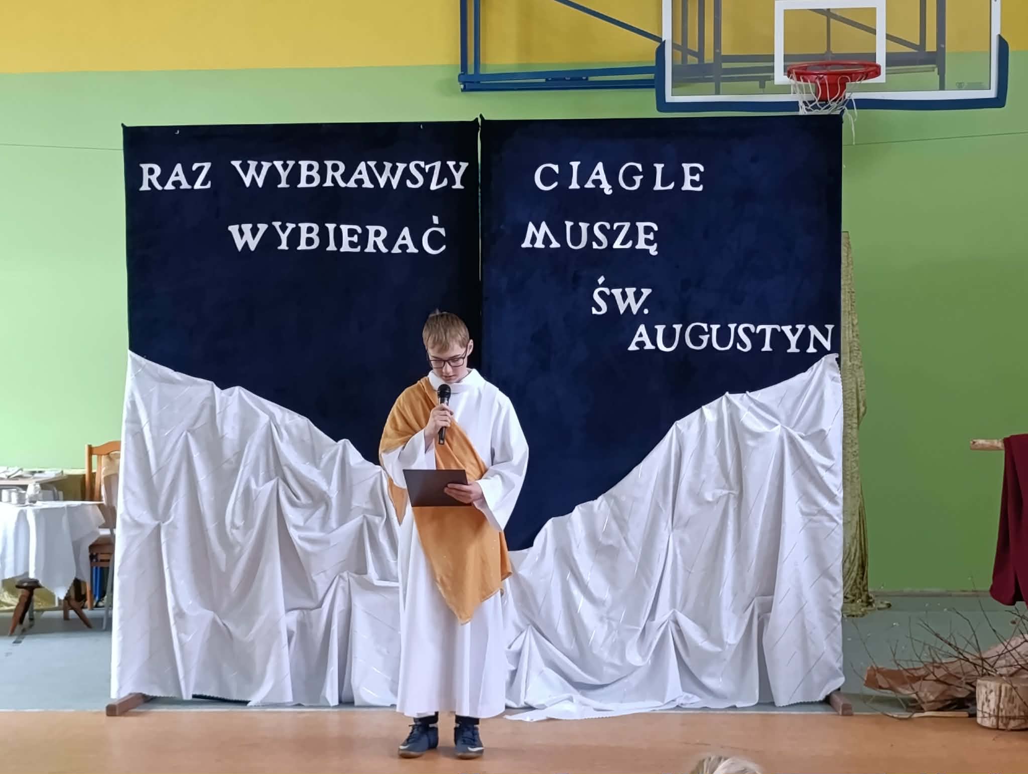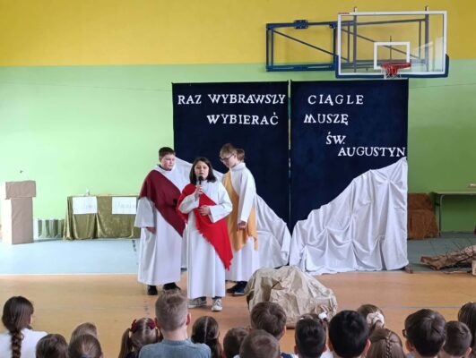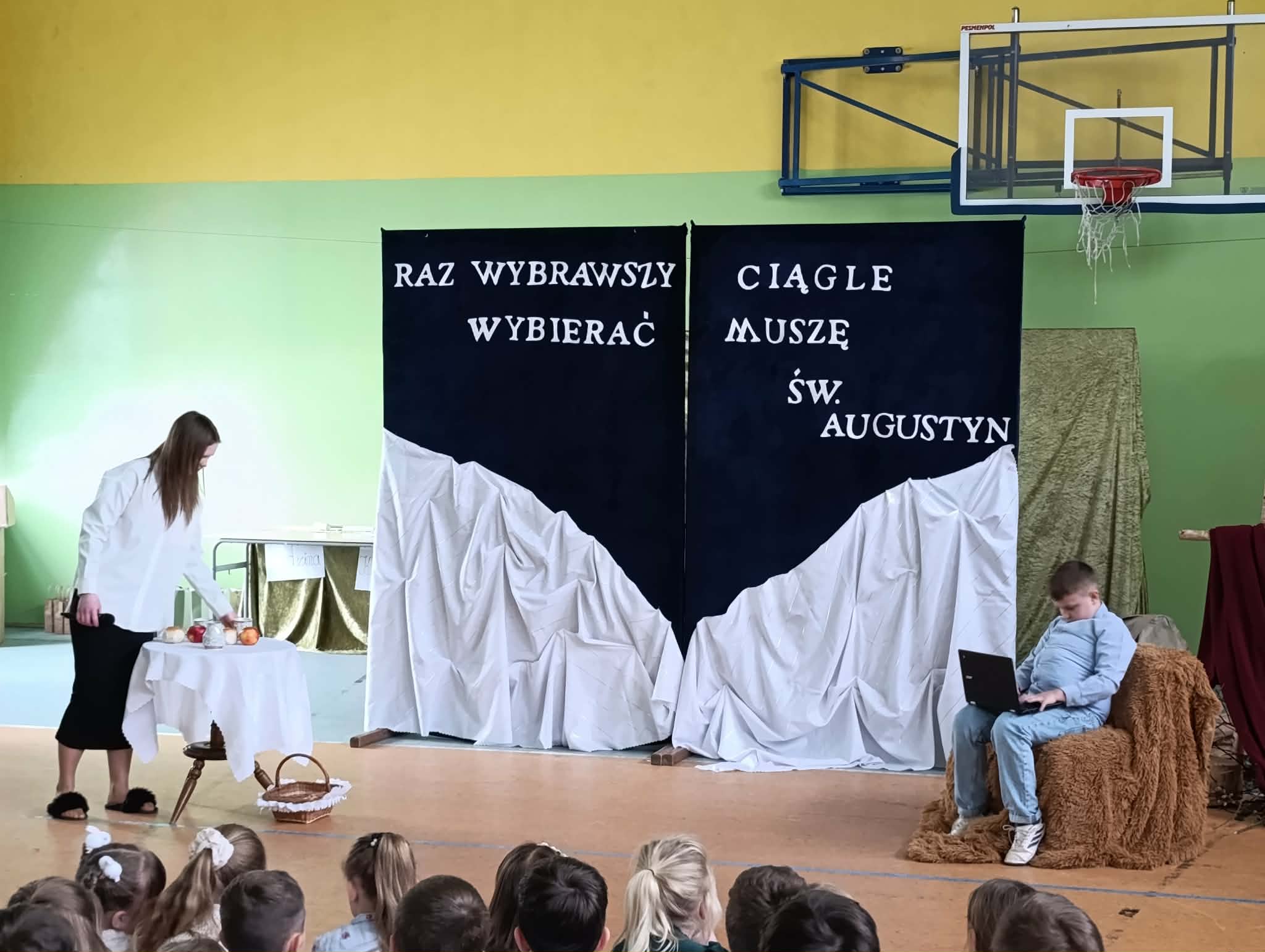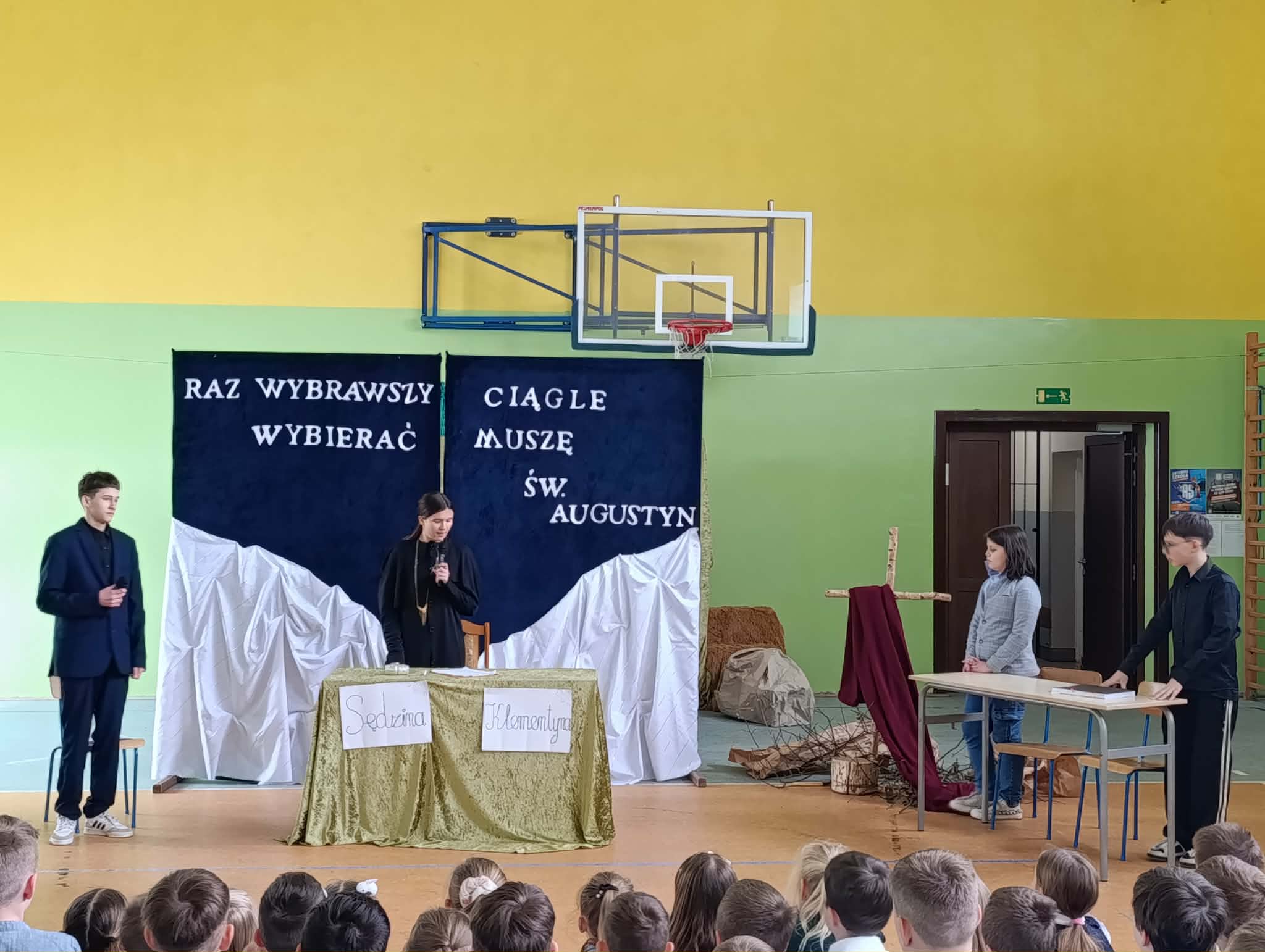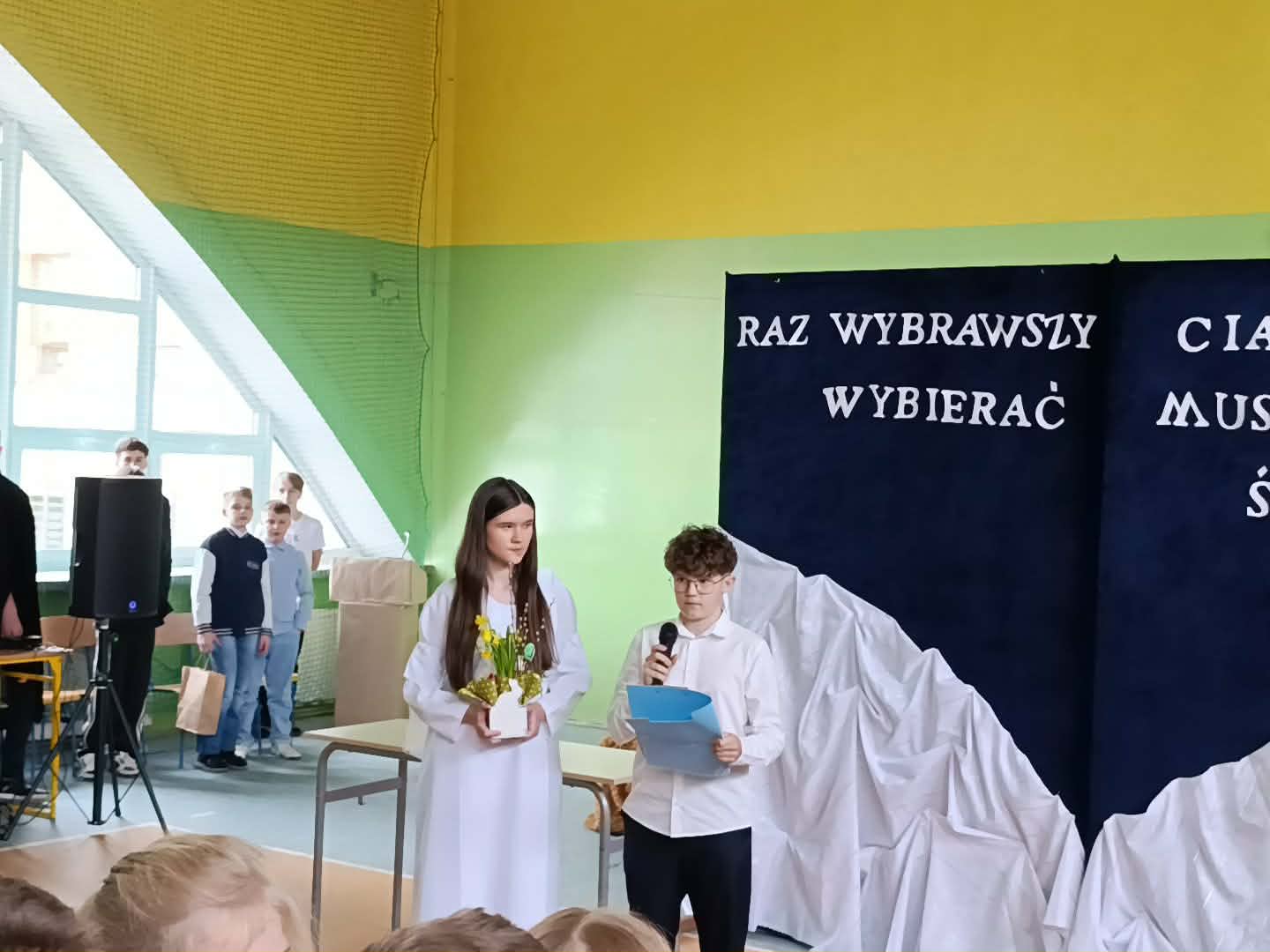 Dnia 1 kwietnia 2026 r. w naszej szkole odbyło się uwspółcześnione misterium Męki Pańskiej przygotowane przez uczniów klasy VII (gościnnie wystąpił Józef Kołodziej i Gabriel Krawczyk z kl. VI), które wprowadziło nas w klimat Triduum Paschalnego oraz Świąt Wielkanocnych. Myśl przewodnią stanowił cytat św. Augustyna „Raz wybrawszy, ciągle wybierać muszę”. Historia skazanego Jezusa Chrystusa, w którego rolę wcielił się Karol Kurek z kl. V, znalazła swój finał w sądzie, gdzie kolejno powoływani świadkowie zeznawali przeciwko Nazarejczykowi. Sędzina wydała ostateczny wyrok - karę śmierci i to na krzyżu. Biblijna Golgota przeplatała się więc z naszą rzeczywistością. Ludzie ciągle muszą dokonywać wyboru. W spektaklu głosem sumienia z jednej strony był anioł, z drugiej – szatan. Ostateczne decyzje zawsze podejmował człowiek. Całość uzupełniała symboliczna dekoracja, którą przygotowała p. U. Harwat oraz przejmująca muzyka.