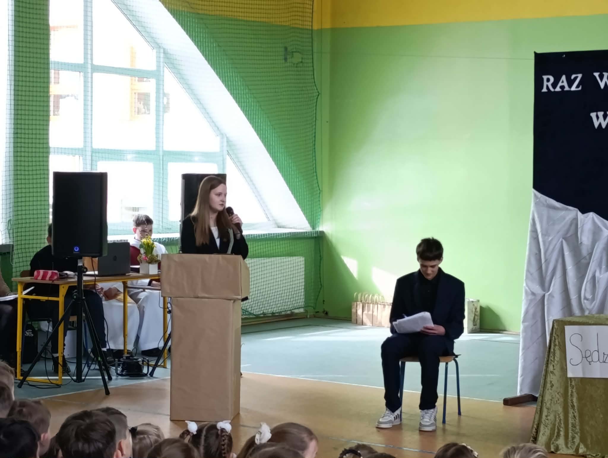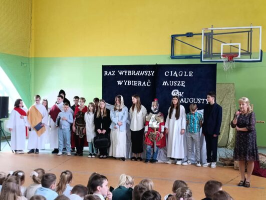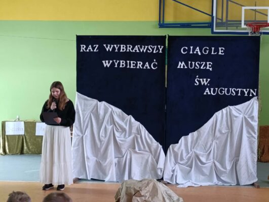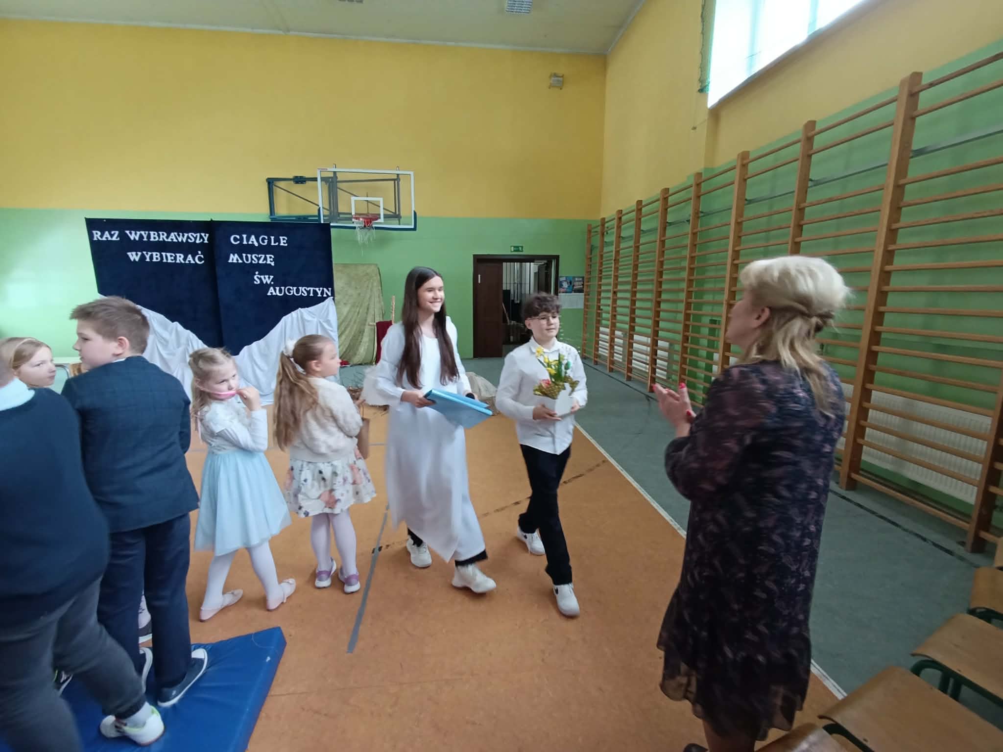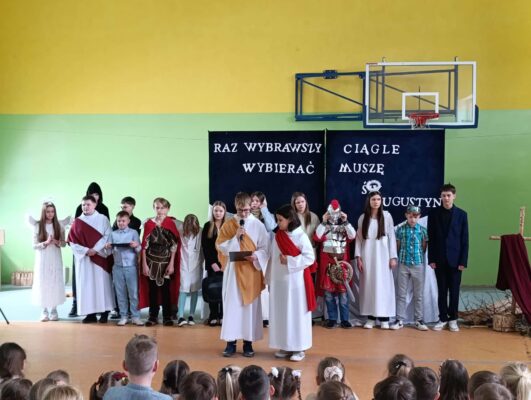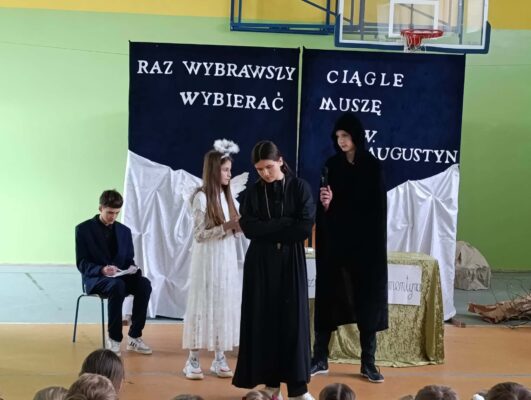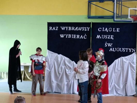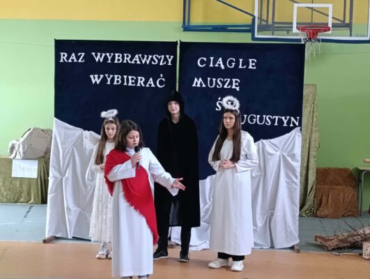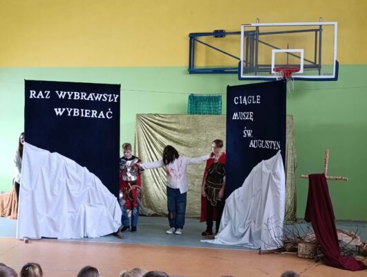 Dnia 1 kwietnia 2026 r. w naszej szkole odbyło się uwspółcześnione misterium Męki Pańskiej przygotowane przez uczniów klasy VII (gościnnie wystąpił Józef Kołodziej i Gabriel Krawczyk z kl. VI), które wprowadziło nas w klimat Triduum Paschalnego oraz Świąt Wielkanocnych. Myśl przewodnią stanowił cytat św. Augustyna „Raz wybrawszy, ciągle wybierać muszę”. Historia skazanego Jezusa Chrystusa, w którego rolę wcielił się Karol Kurek z kl. V, znalazła swój finał w sądzie, gdzie kolejno powoływani świadkowie zeznawali przeciwko Nazarejczykowi. Sędzina wydała ostateczny wyrok - karę śmierci i to na krzyżu. Biblijna Golgota przeplatała się więc z naszą rzeczywistością. Ludzie ciągle muszą dokonywać wyboru. W spektaklu głosem sumienia z jednej strony był anioł, z drugiej – szatan. Ostateczne decyzje zawsze podejmował człowiek. Całość uzupełniała symboliczna dekoracja, którą przygotowała p. U. Harwat oraz przejmująca muzyka.