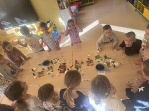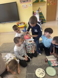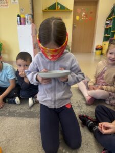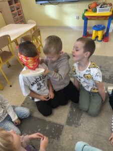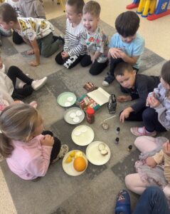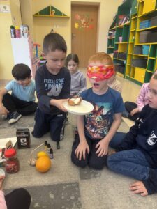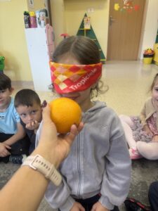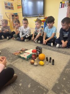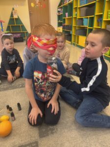 W październiku w ramach innowacji „Ścieżki zmysłów – rozwój przez doświadczenia” w grupie Tygrysków poznawaliśmy świat zapachów. Podczas „Zapachowej zgaduj-zgaduli” dzieci rozpoznawały aromaty m.in. olejków eterycznych (miętowego, cytrynowego, lawendowego, z drzewa herbacianego), kawy, herbat owocowych, cebuli, czosnku, kakao, goździków, pomarańczy i cytryny.