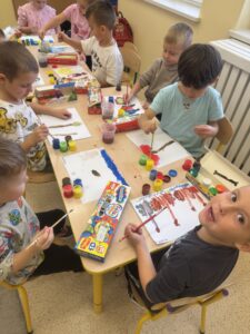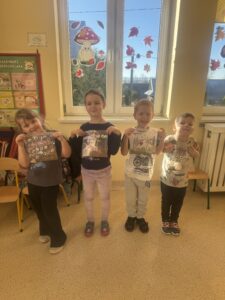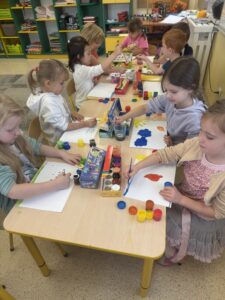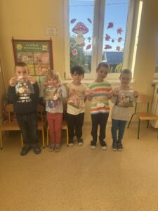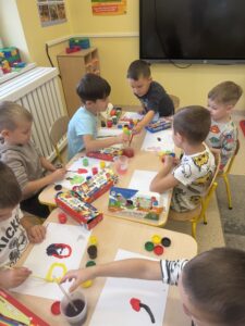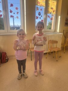 Podczas zapachowej pracy plastycznej malowały jesień farbami z dodatkiem olejków zapachowych – cytrynowego, lawendowego, miętowego i z drzewa herbacianego. Powstały barwne, pachnące obrazy jesiennej pogody.