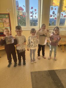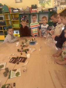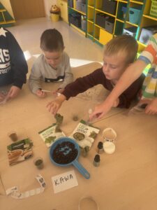 Wykonaliśmy także woreczki zapachowe z ziarnistą kawą, przyprawami, ziołami i olejkami, które dzieci z radością ozdabiały kolorowymi naklejkami. Zajęcia dostarczyły wielu radosnych, pachnących i twórczych doświadczeń!